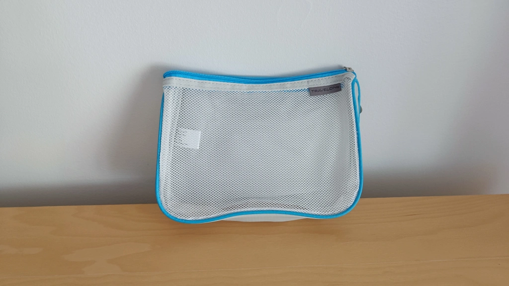 This Travelon packing cube is perfect for keeping your suitcase organized! It's white with blue trim and a zipper closure. Great for travel or home storage