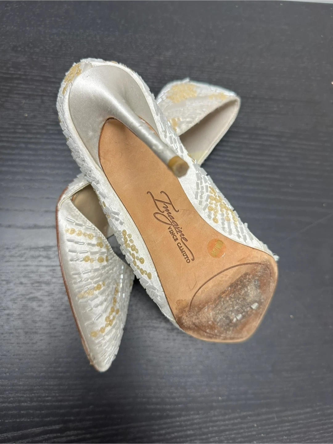 Selling a pair of Imagine Vince Camuto heels. They are white with gold detailing. There are some signs of wear on the soles, but they're otherwise in good condition!