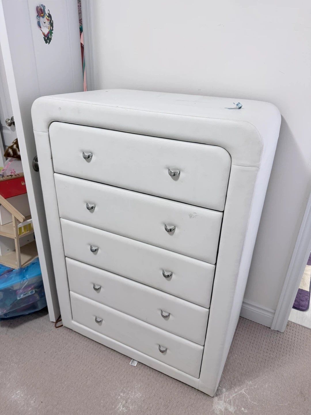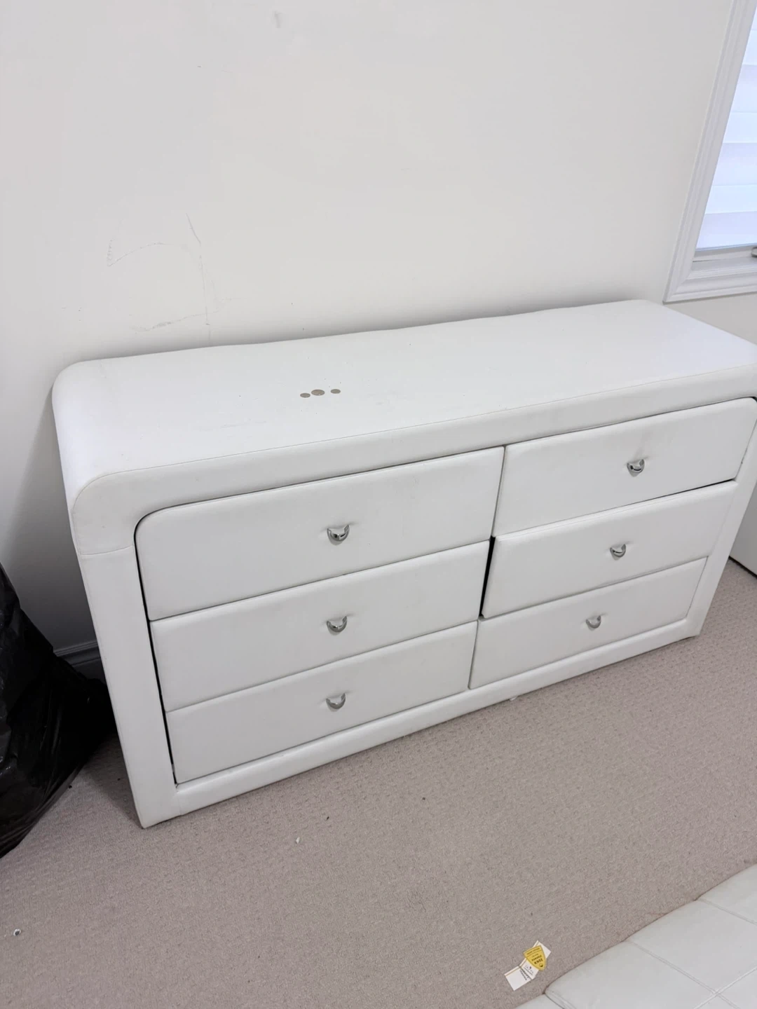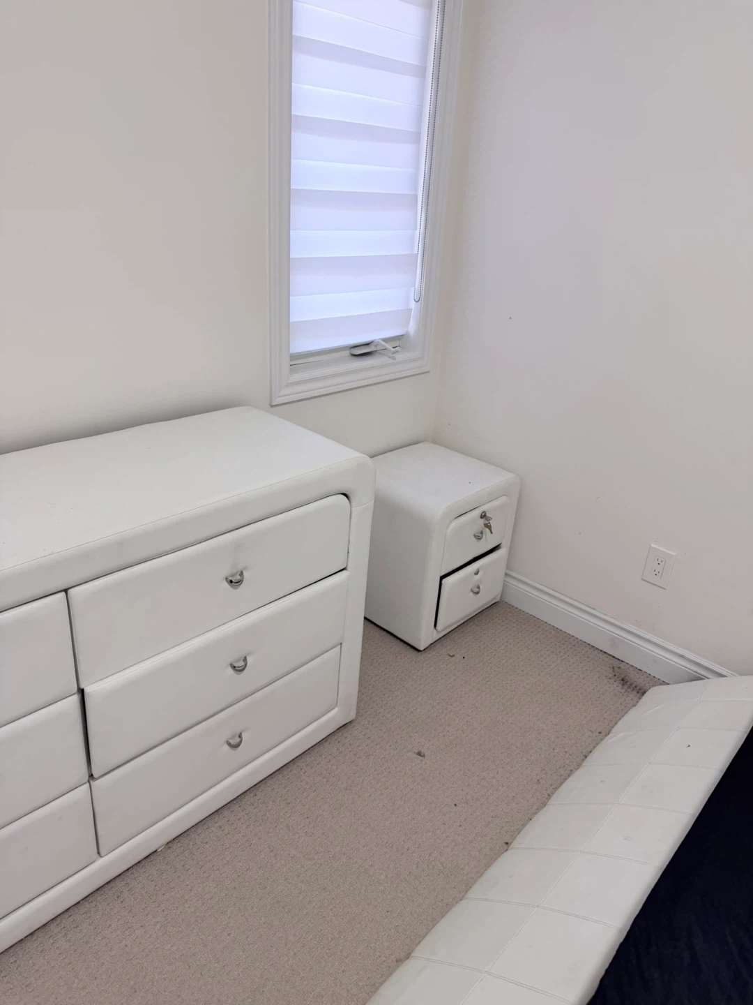 54Bedroom set for free. Includes a dresser, two nightstands, chest of drawers, and a unique bed frame. All pieces are white and in good condition. Perfect for furnishing a bedroom with a modern look. Free pickup in Caledon East.