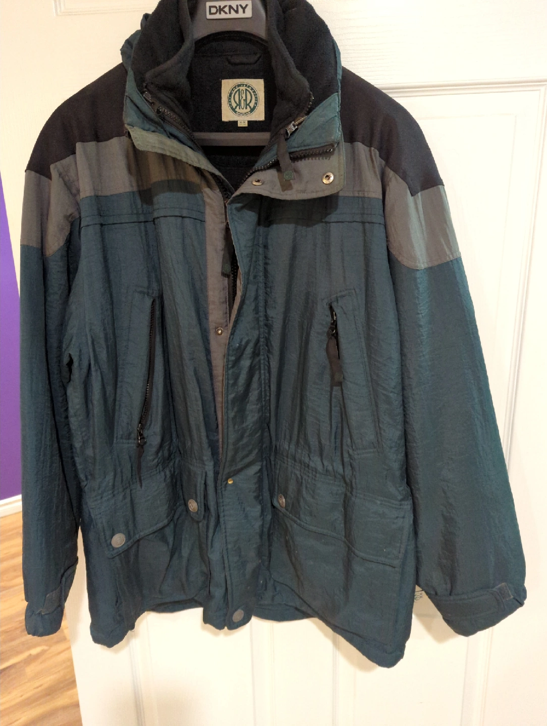 83Selling a vintage JBR parka jacket in size medium. It's a stylish and functional jacket, perfect for cooler weather. The jacket features a unique colour block design with shades of green and grey. It's in great condition and ready for a new home