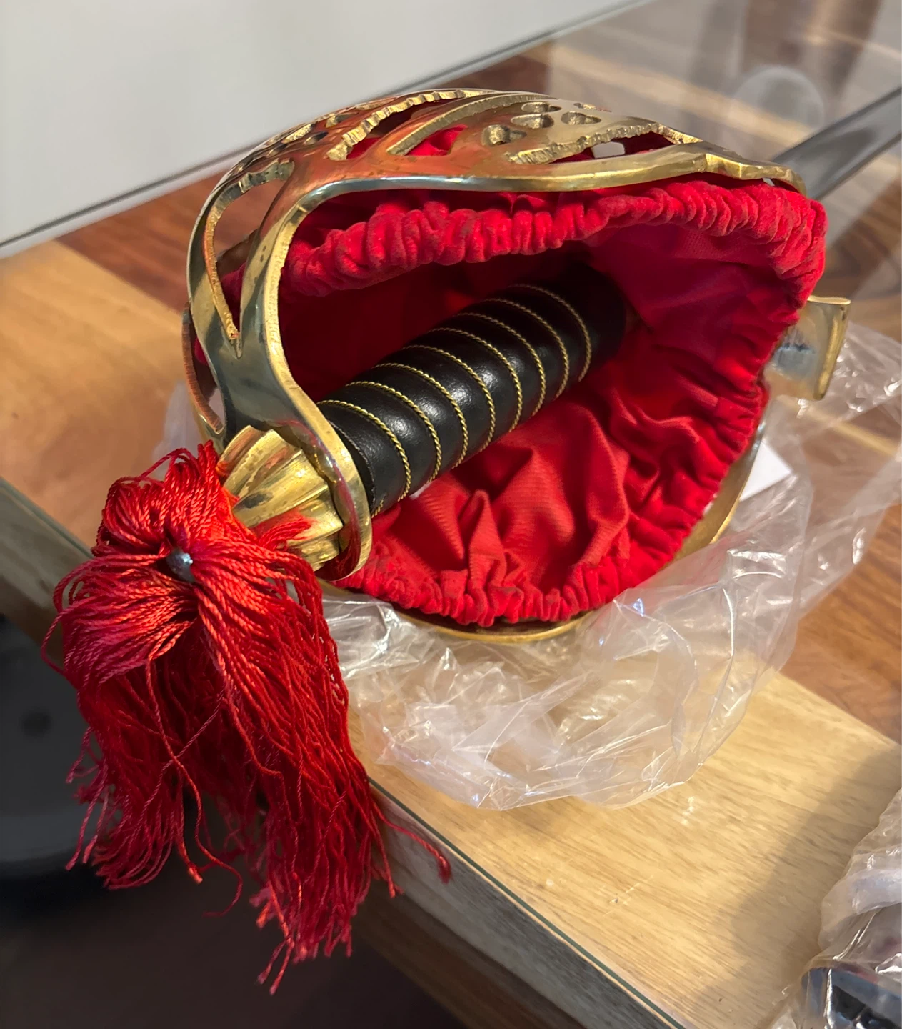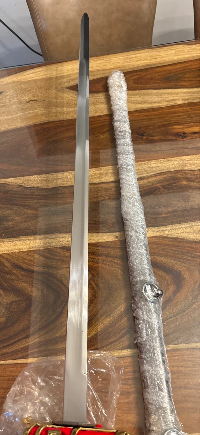 Selling a NEW ceremonial Scottish sword. It comes with a decorative hilt featuring red velvet lining and a tassel. The blade is unsharpened and separate from the display sheath and both are lightly oiled and wrapped in protective material.