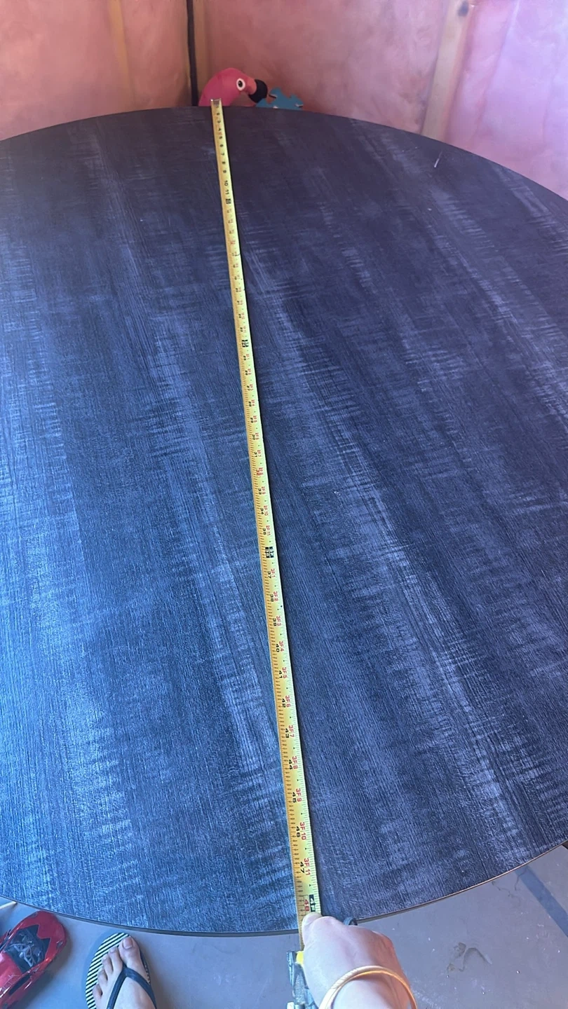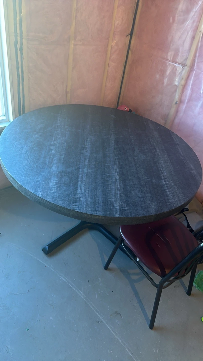 Selling a round dining table that would be great for a smaller space. It has a dark grey/black top and a black metal base. The table is 4 feet in diameter and about 30 inches tall.