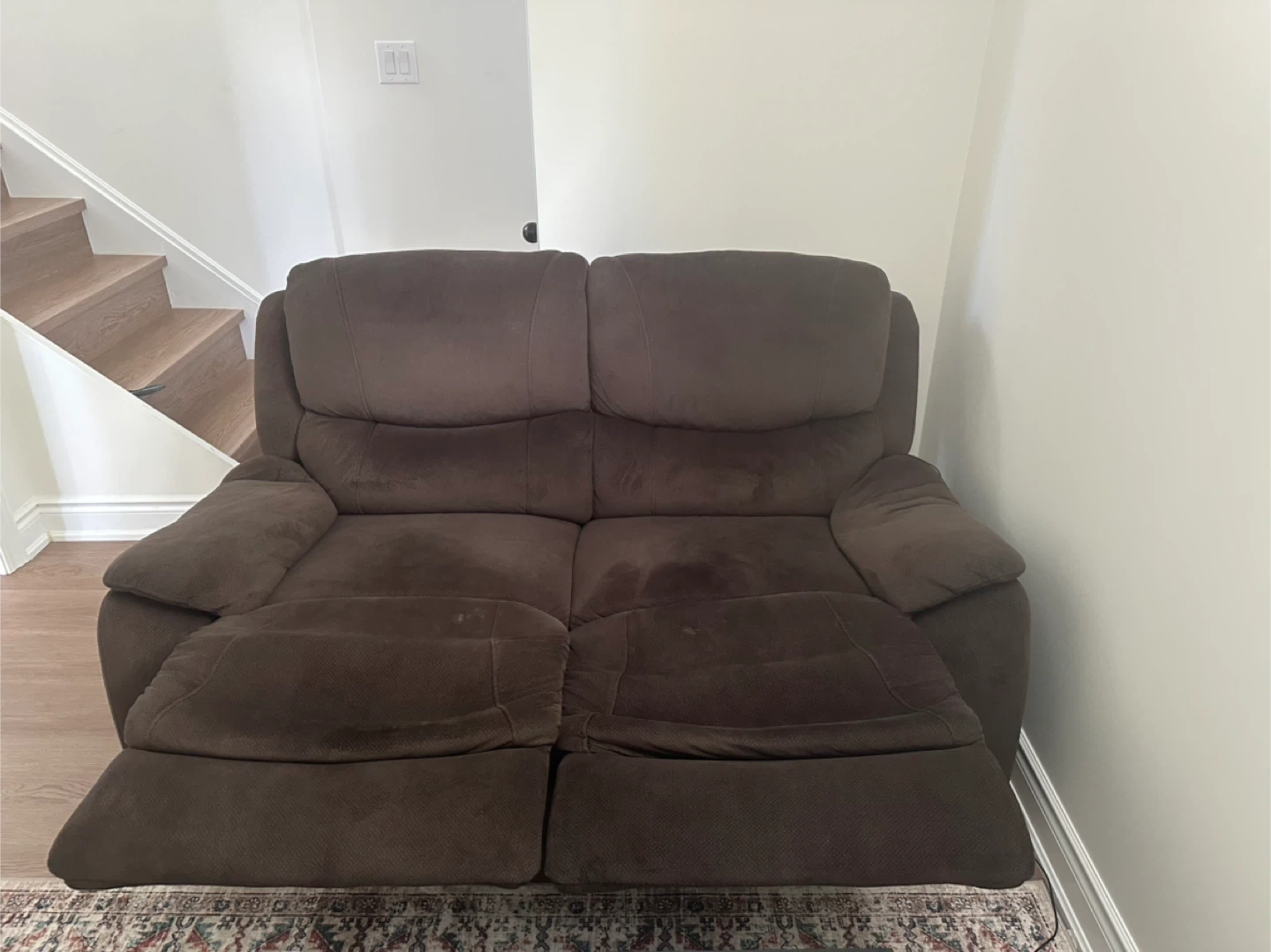 Comfortable two-seater recliner sofa in a rich chocolate brown color. Both seats recline smoothly and are very comfortable for relaxing, watching TV, or reading.