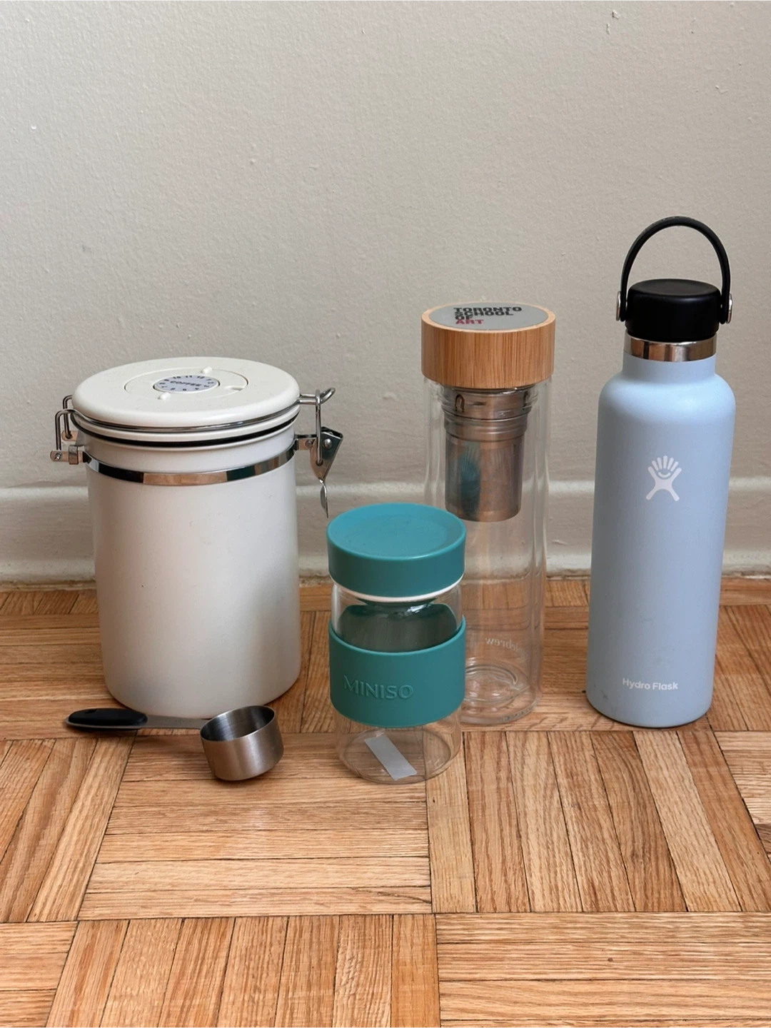 Selling a bundle of water bottle, tea glass bottle, glass container and a metal container for coffee with spoon and calendar at the top.
