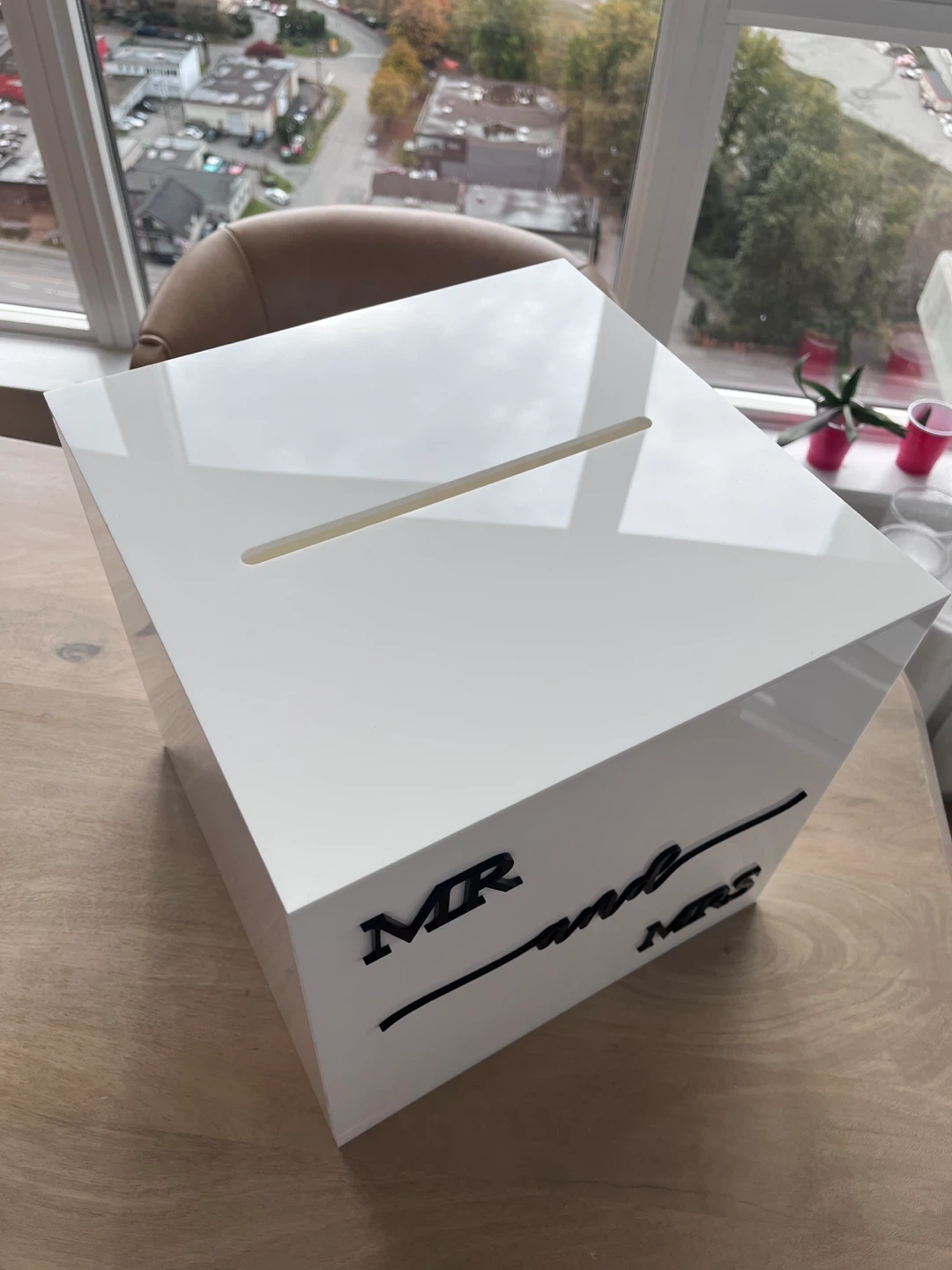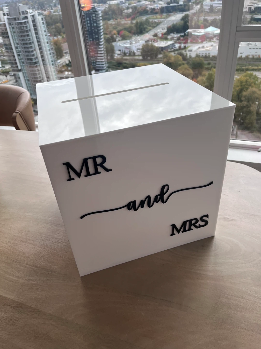 Selling a lovely white acrylic card box, perfect for a wedding! It has 'Mr and Mrs' in black lettering on the front. It's in great condition.