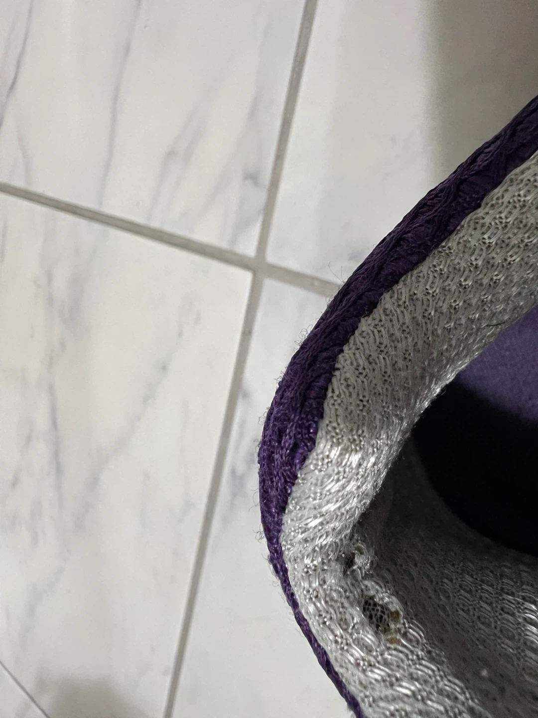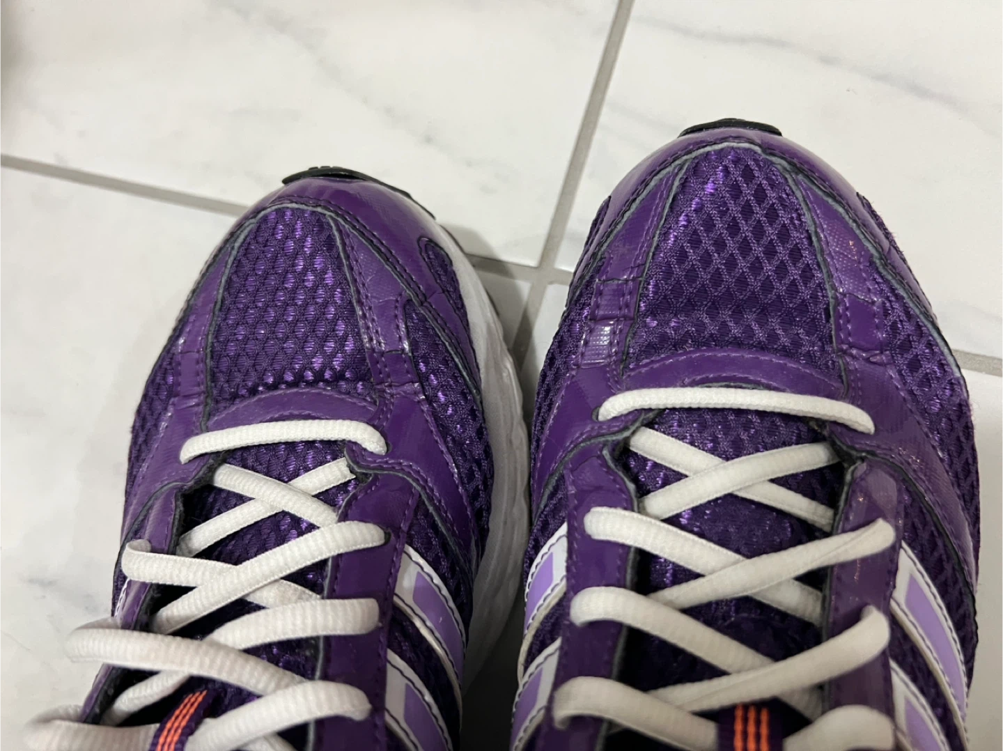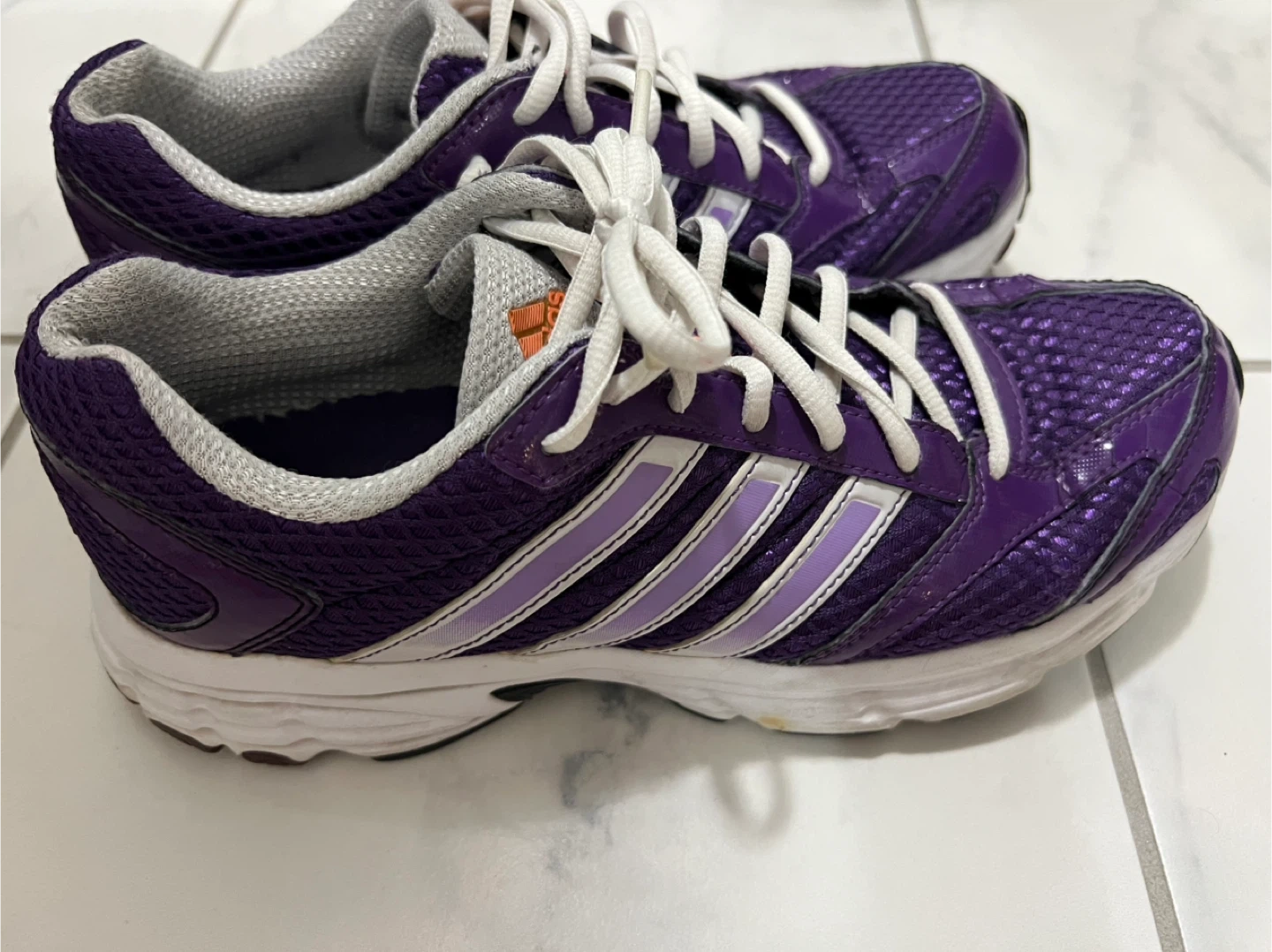 167Selling a pair of Adidas running shoes in purple with white stripes. They're in good condition and ready for your next run! Only a few small damages showing on the last photos