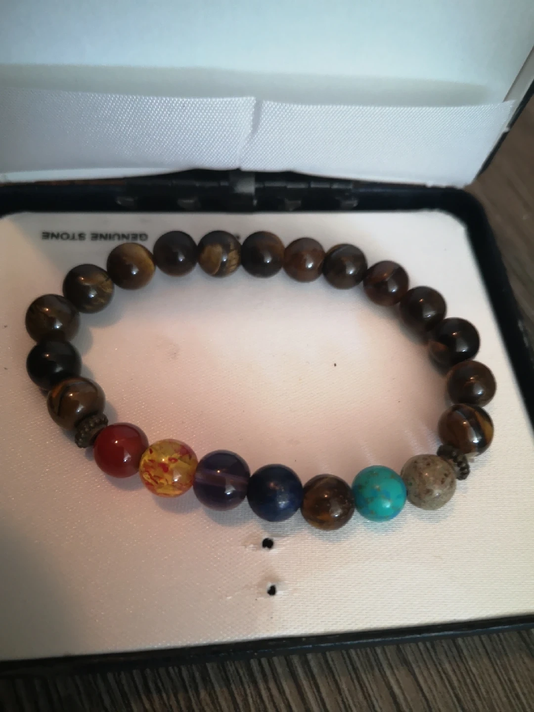 Here's a lovely bracelet featuring tiger's eye and chakra stones! It comes in a box, making it perfect for gifting or keeping it safe when you're not wearing it. A beautiful piece to add to your collection!