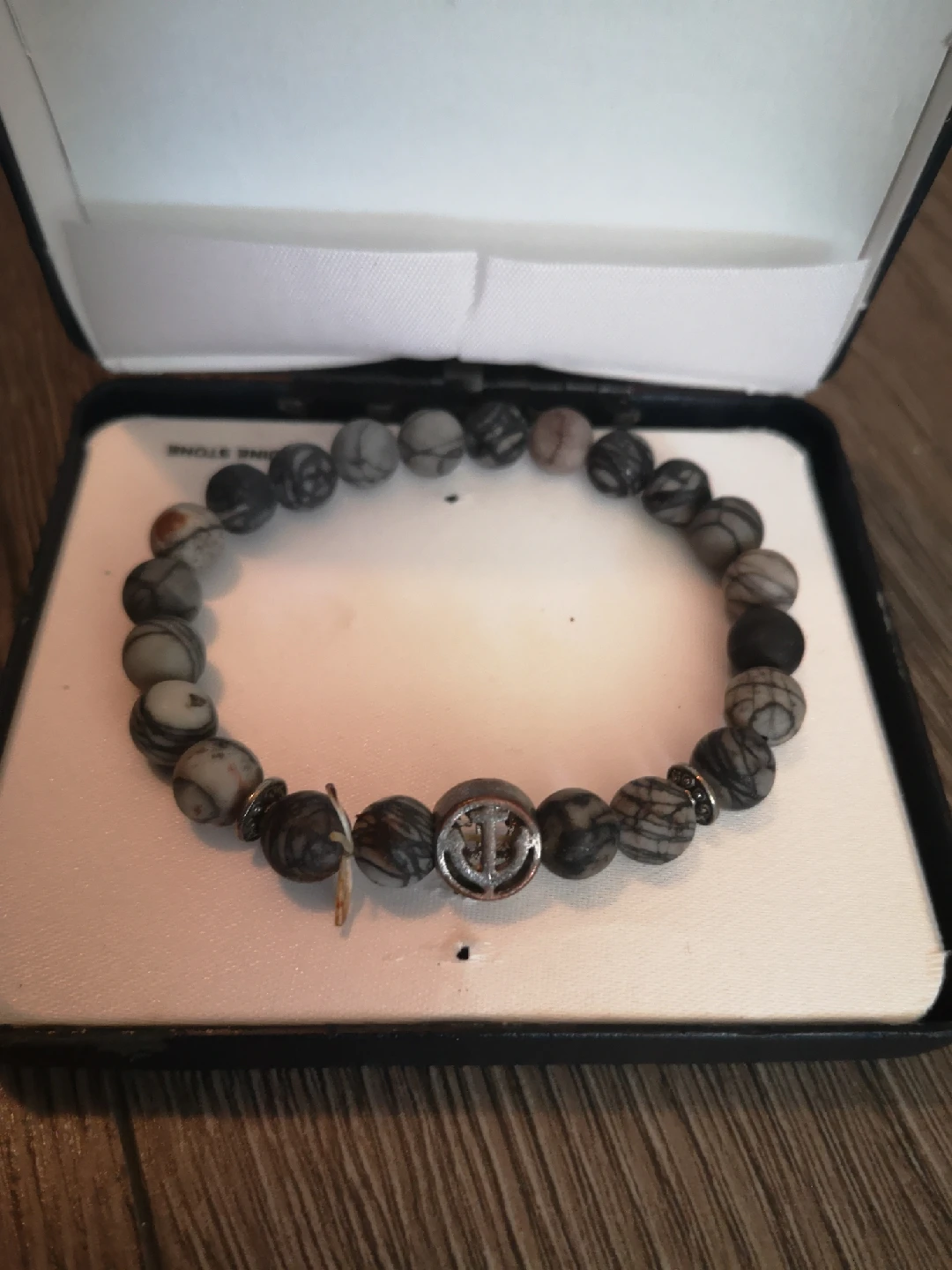 Selling a beaded bracelet with a cool anchor charm! It comes in a box, perfect for gifting or keeping it safe. The beads are a mix of grey and black, giving it a stylish look
