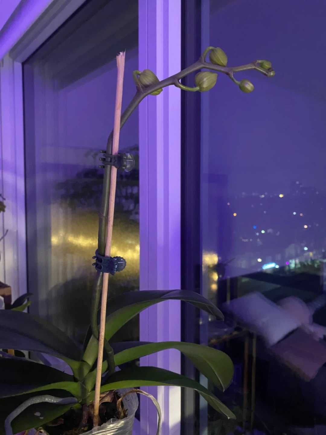 Selling a healthy orchid plant in a clear plastic pot. It includes a support stake with clips to help it grow straight. It's a beautiful addition to any home!