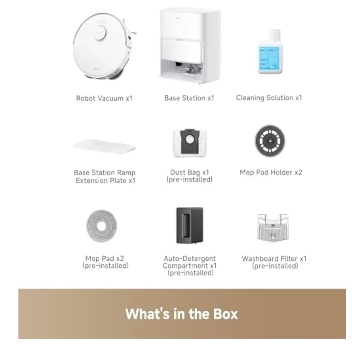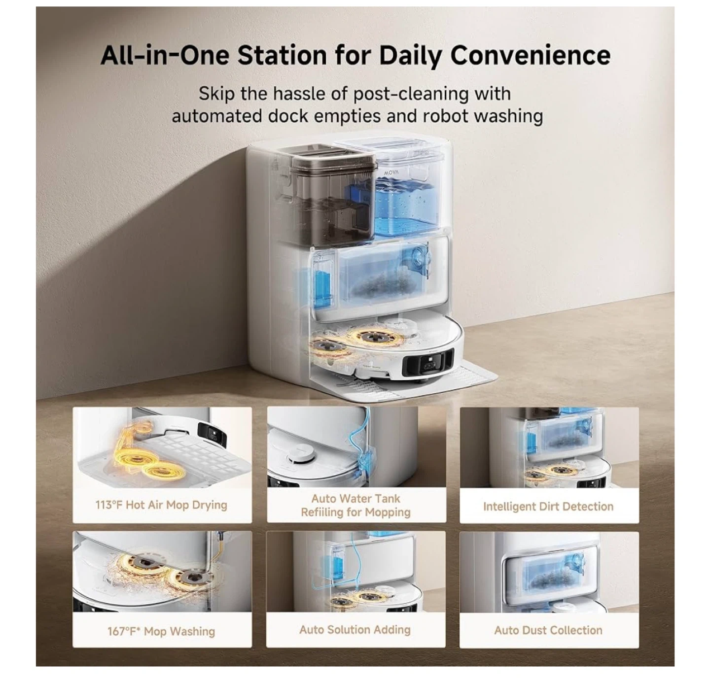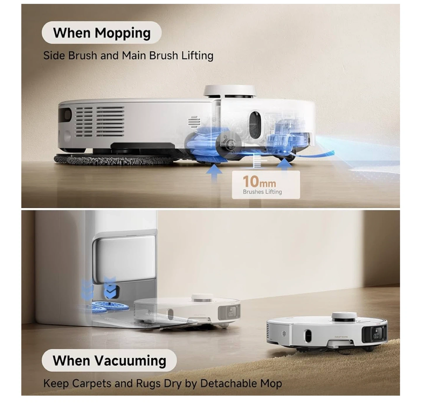 It boasts 19,000Pa suction power to tackle messes from pet food to dust particles. The all-in-one station offers daily convenience with features like hot air mop drying, auto water tank refilling, and intelligent dirt detection. Keep your carpets and rugs dry with the detachable mop!