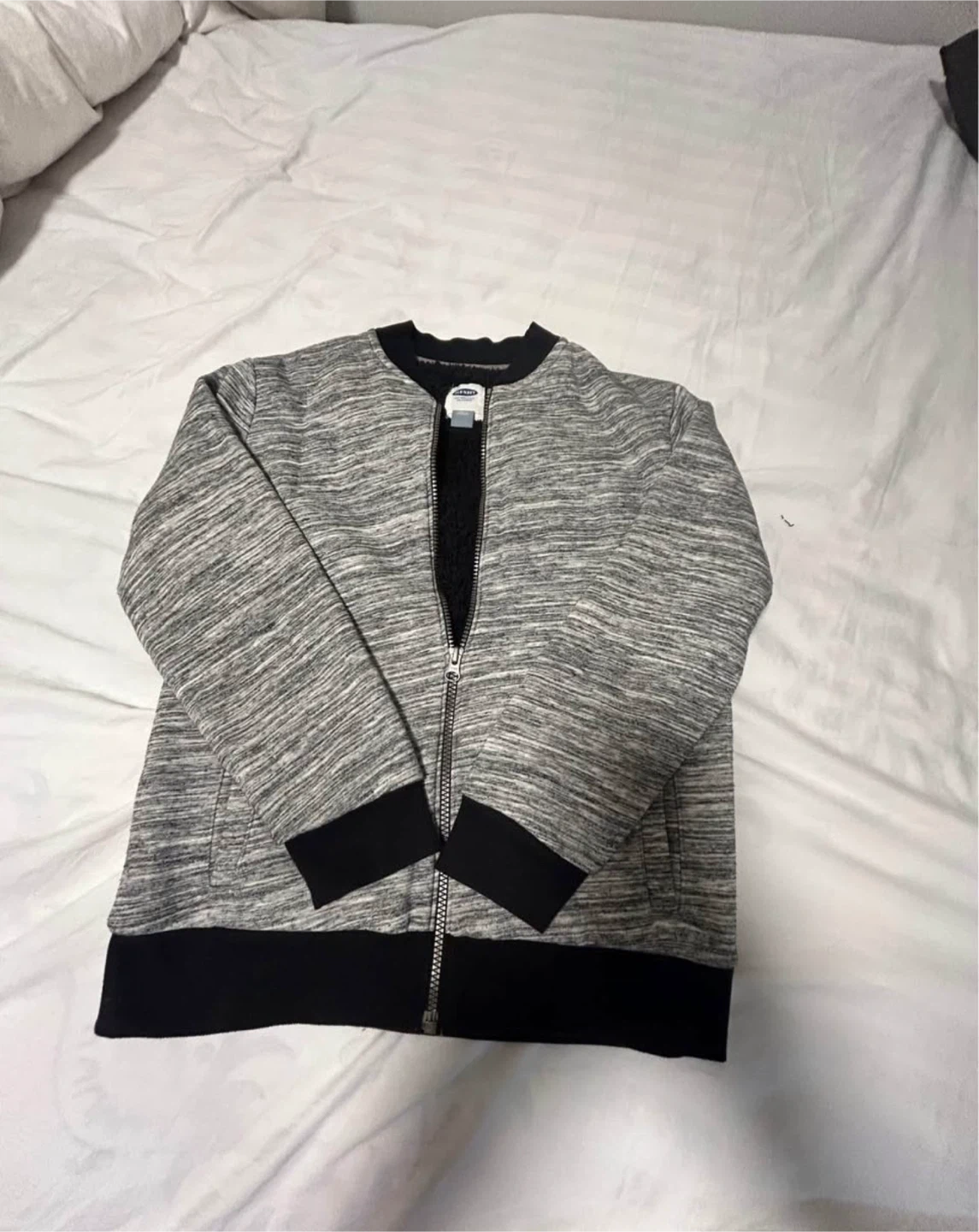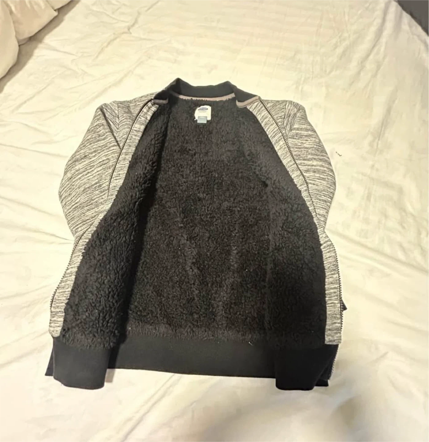 Selling a cozy Old Navy zip-up jacket in grey for boys/teens! It's lined with soft, black faux fur for extra warmth. Perfect for layering on chilly days