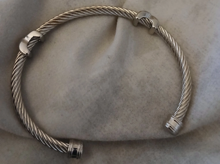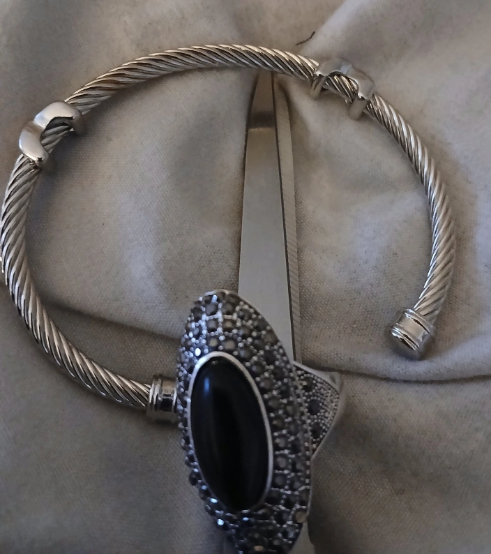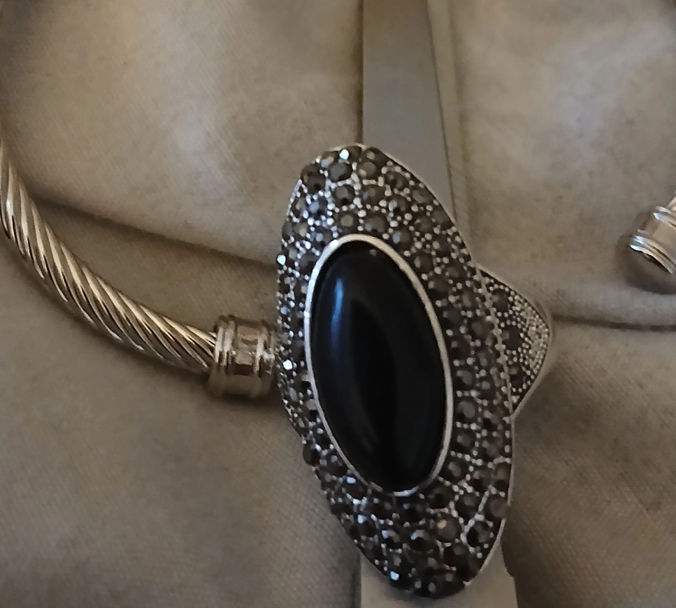 Selling a silver cable bangle bracelet. It's in great condition and ready for a new home! It's a stylish piece that would complement any outfit. Black stone Ring surrounded by black and clear crystals