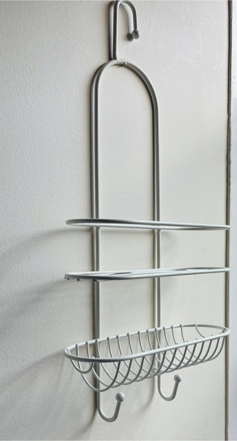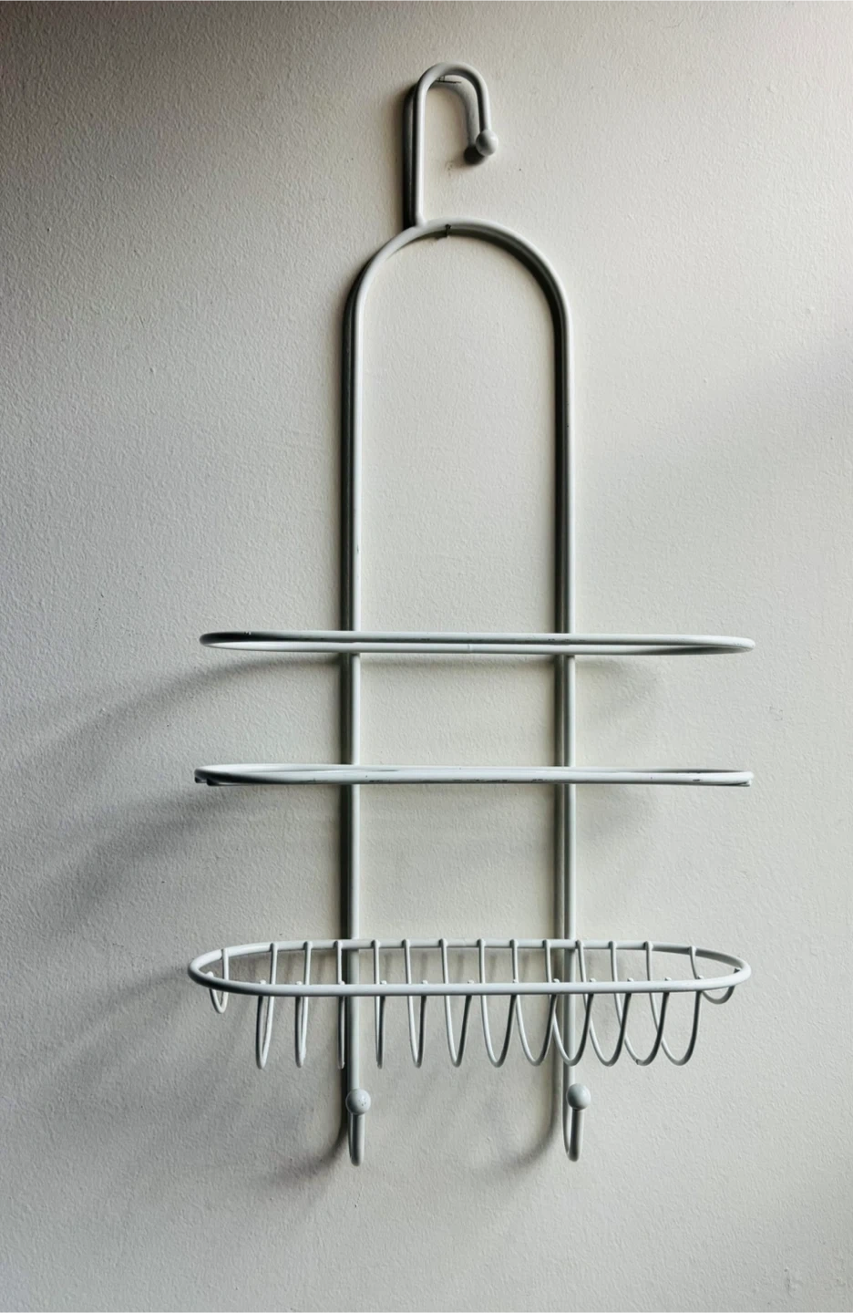This over-the-shower white caddy is perfect for keeping your bathroom organized! It features two shelves and a basket to hold all your shower essentials. It's in great condition and ready to use