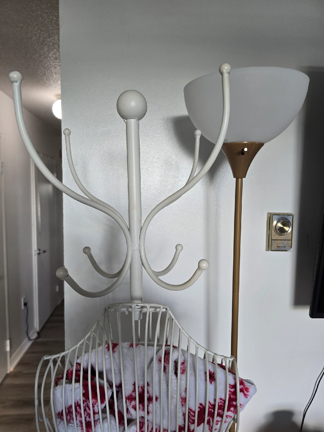 Selling a white metal mannequin coat rack stand. It's a unique and stylish piece for organizing your coats and accessories. It's in great condition and ready for a new home!