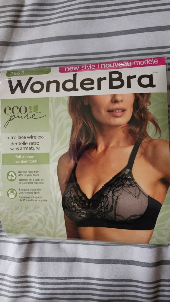Selling brand new Wonder Bra Eco Pure Retro Lace Wireless Bras in size 44DD! These bras feature beautiful soft-touch recycled cups and are built up with a seamless frame for extra wireless support. They are designed to offer full coverage and comfort. Each bra is made from 60% fibres and the packaging is made with 80% recycled fibres.