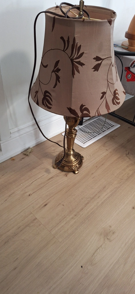 Selling a table lamp with a beige shade and brown floral design. The base is a decorative gold colour. It's in good condition and would look great in any room