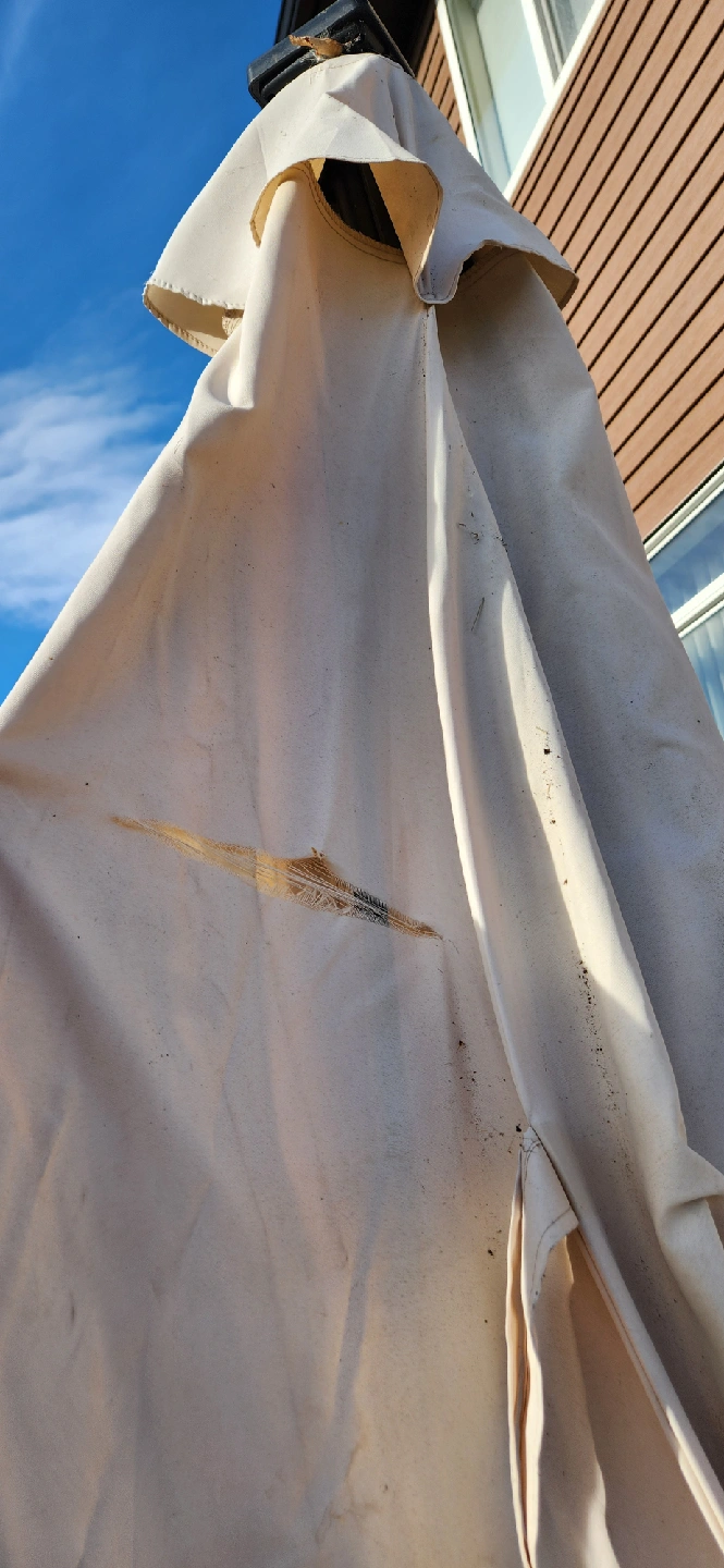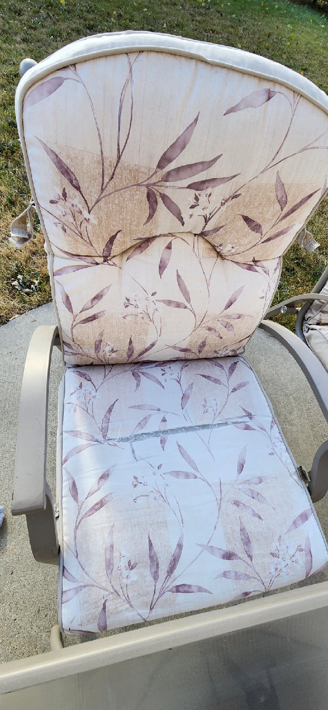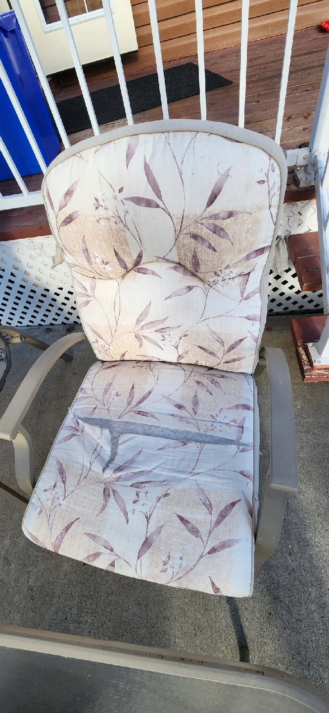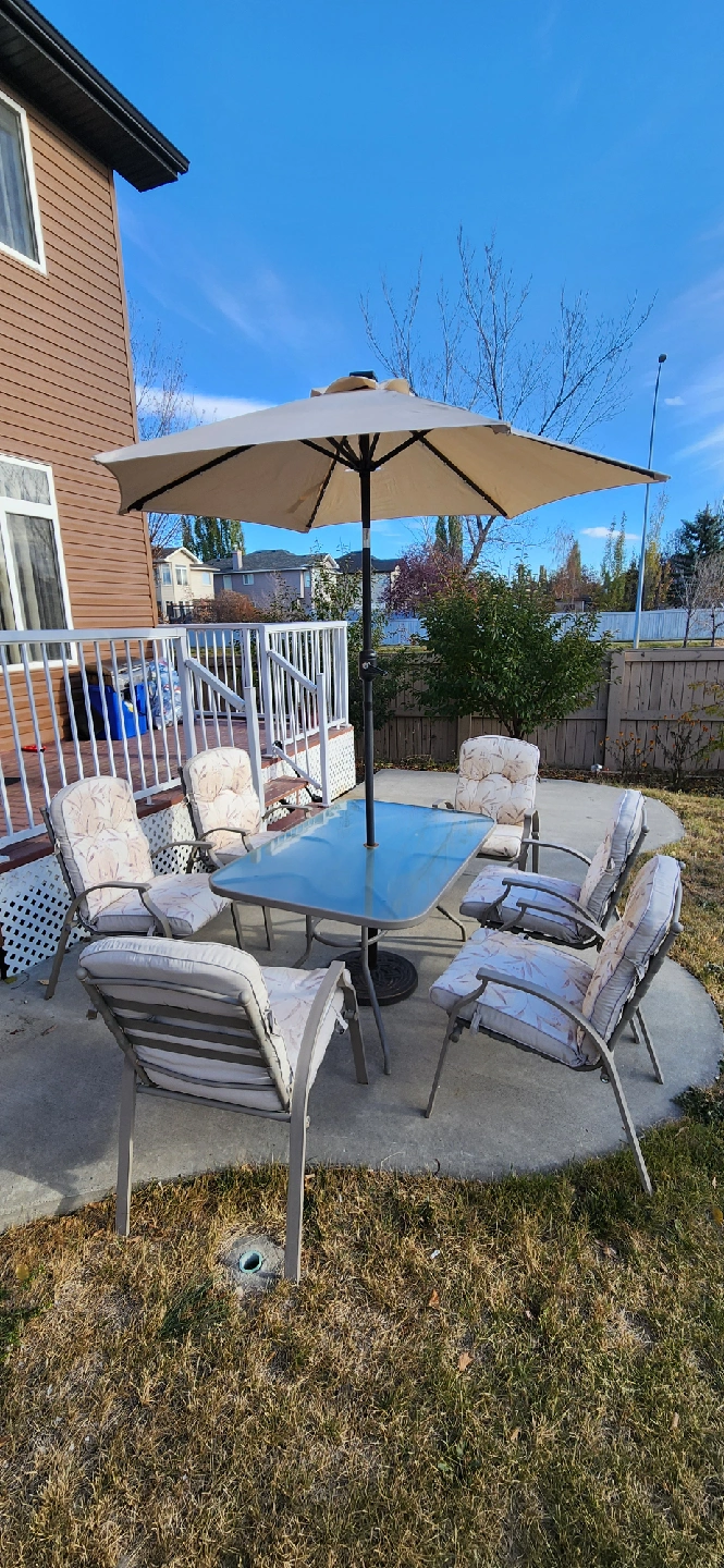 39(Moving sale) Selling a patio table with six chairs and an umbrella. The set has a glass table top and neutral-toned cushions with a leaf pattern, you can get cover for the cushions or you can replace them ,because 2 of them are torn. Perfect for enjoying the outdoors.