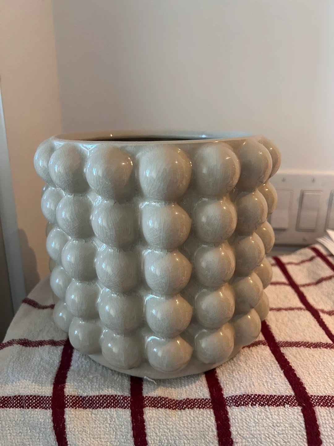 Selling a cute off-white ceramic vase! It has a unique bubble design around the outside and a wavy pattern on the inside. It would look great with plants or flowers or just use it as a show piece