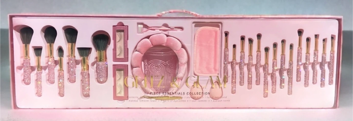 Selling a Glitz & Glam 30 Piece Essentials Collection! This set includes makeup brushes with sparkly pink handles, false eyelashes, a makeup remover towel, and other accessories. It's a complete set for all your makeup needs!