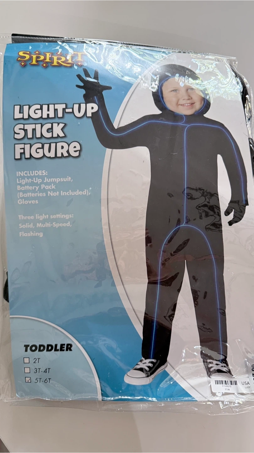 Selling a Spirit Halloween light-up stick figure costume! It's toddler size 5T-6T and includes the light-up jumpsuit, battery pack (batteries not included), and gloves. It also has three light settings: solid, multi-speed, and flashing