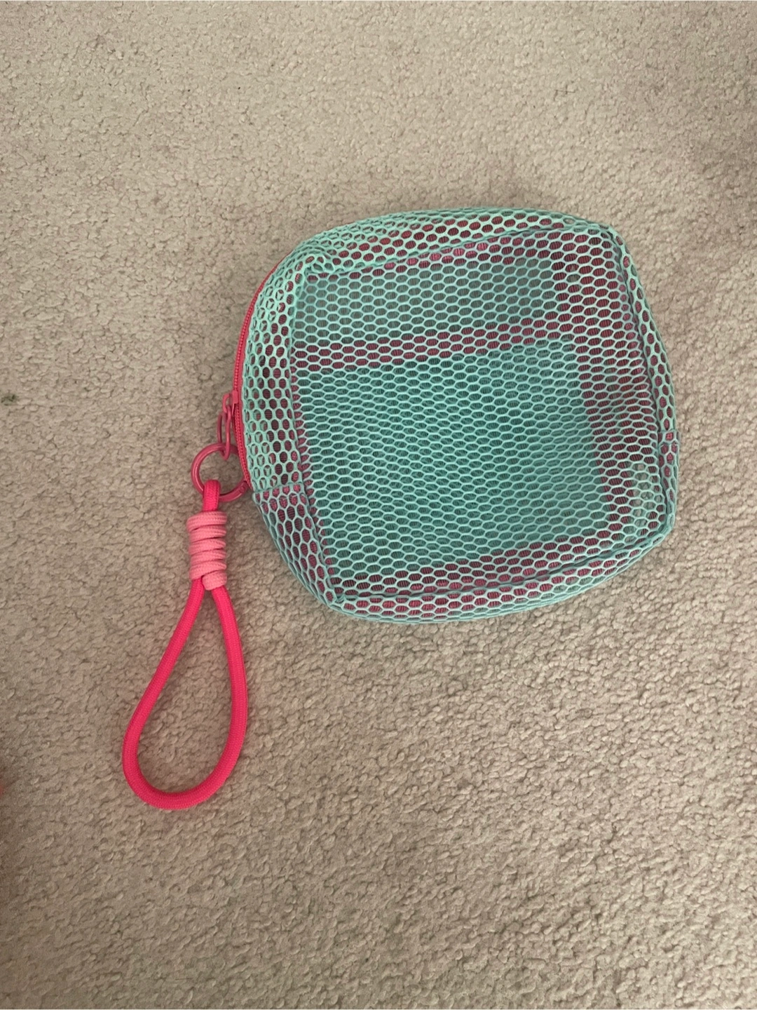 Here's a cute little mesh zipper pouch! It's aqua with pink trim and a pink zipper pull. Perfect for storing small items or using as a travel pouch