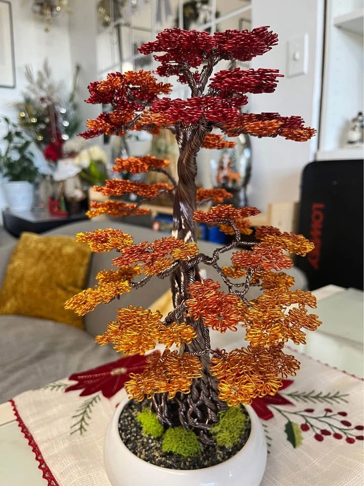 Add a touch of fall to your space with this stunning handmade bonsai in warm copper and gold tones. A one-of-a-kind art piece that brings autumn’s beauty indoors!