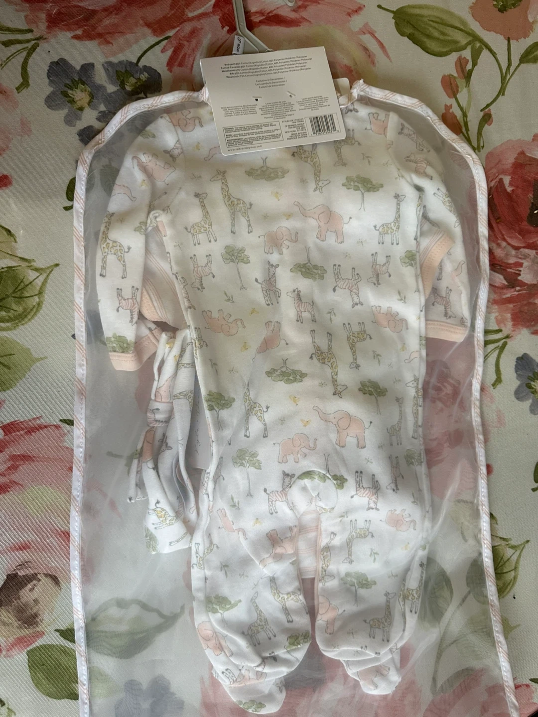 This adorable Kyle & Deena 8-piece baby gift set is perfect for a newborn! It includes a bodysuit, footed overall, bib, hat, and comes in a garment/travel bag.0-3 months It's all brand new I bought it 25$ + tax but I missed the return date.