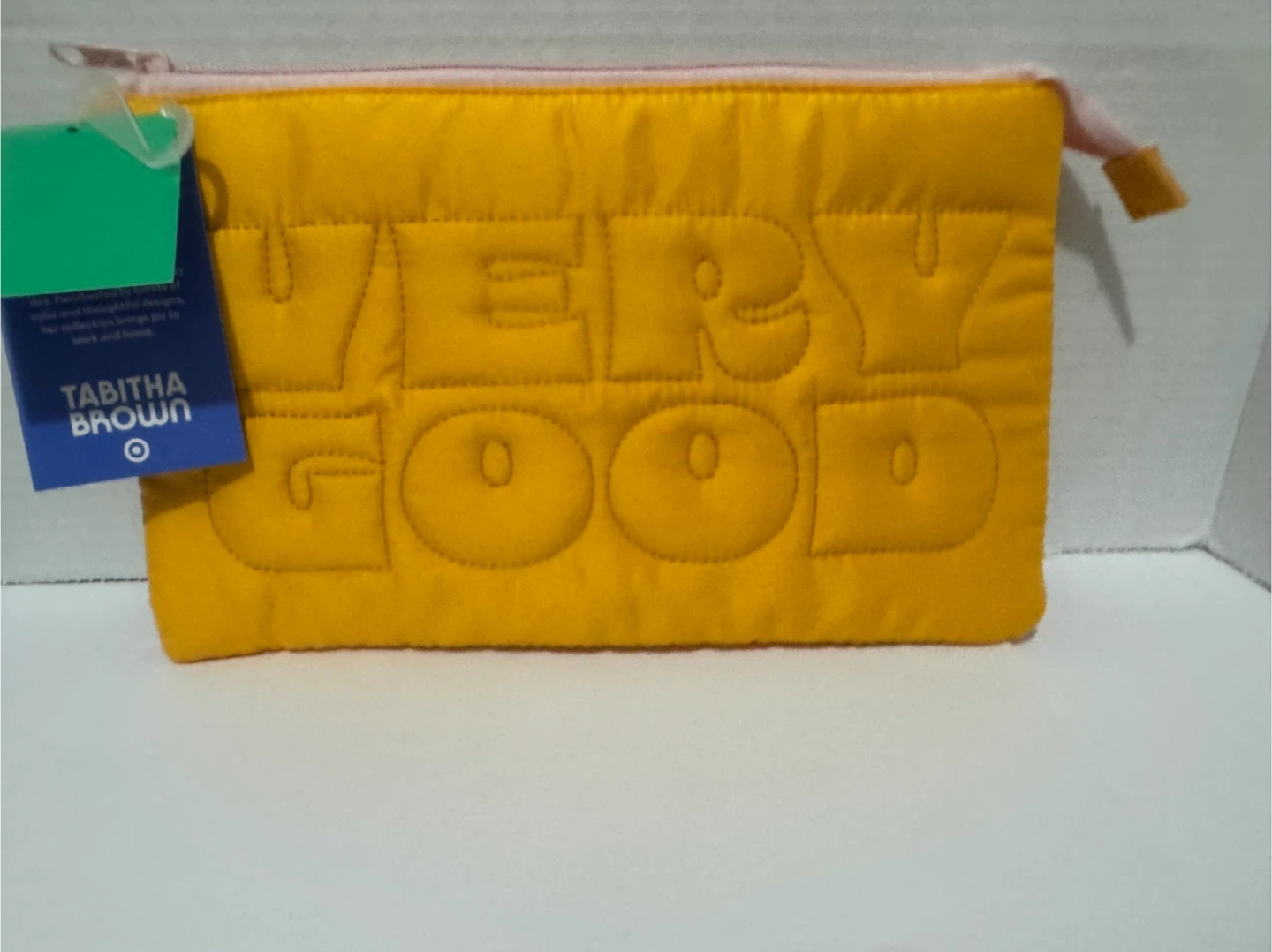 78This cute Tabitha Brown for Target pouch is brand new with tags! It's a vibrant yellow colour with 'VERY GOOD' quilted on the front. Perfect for organizing your essentials in style