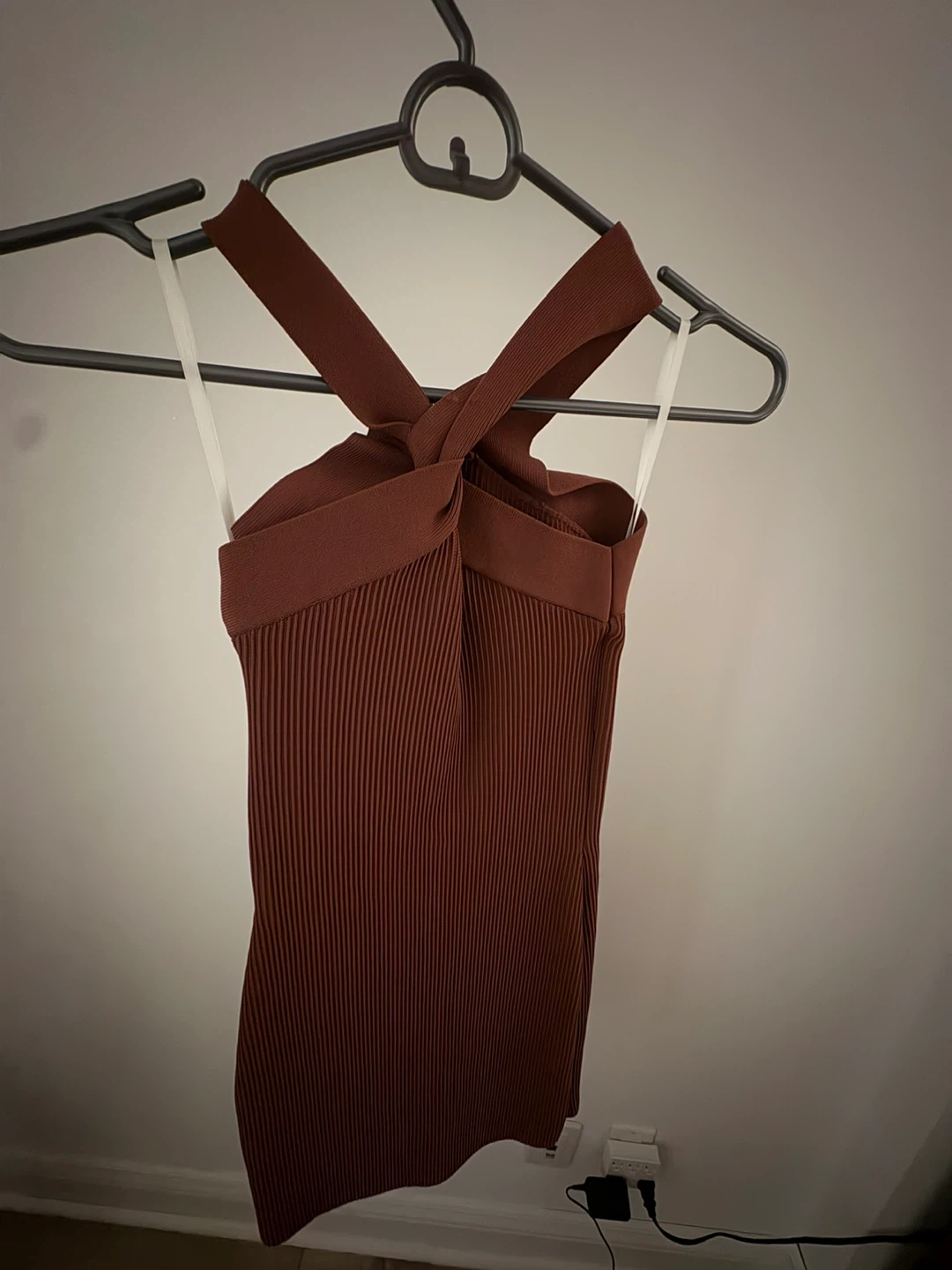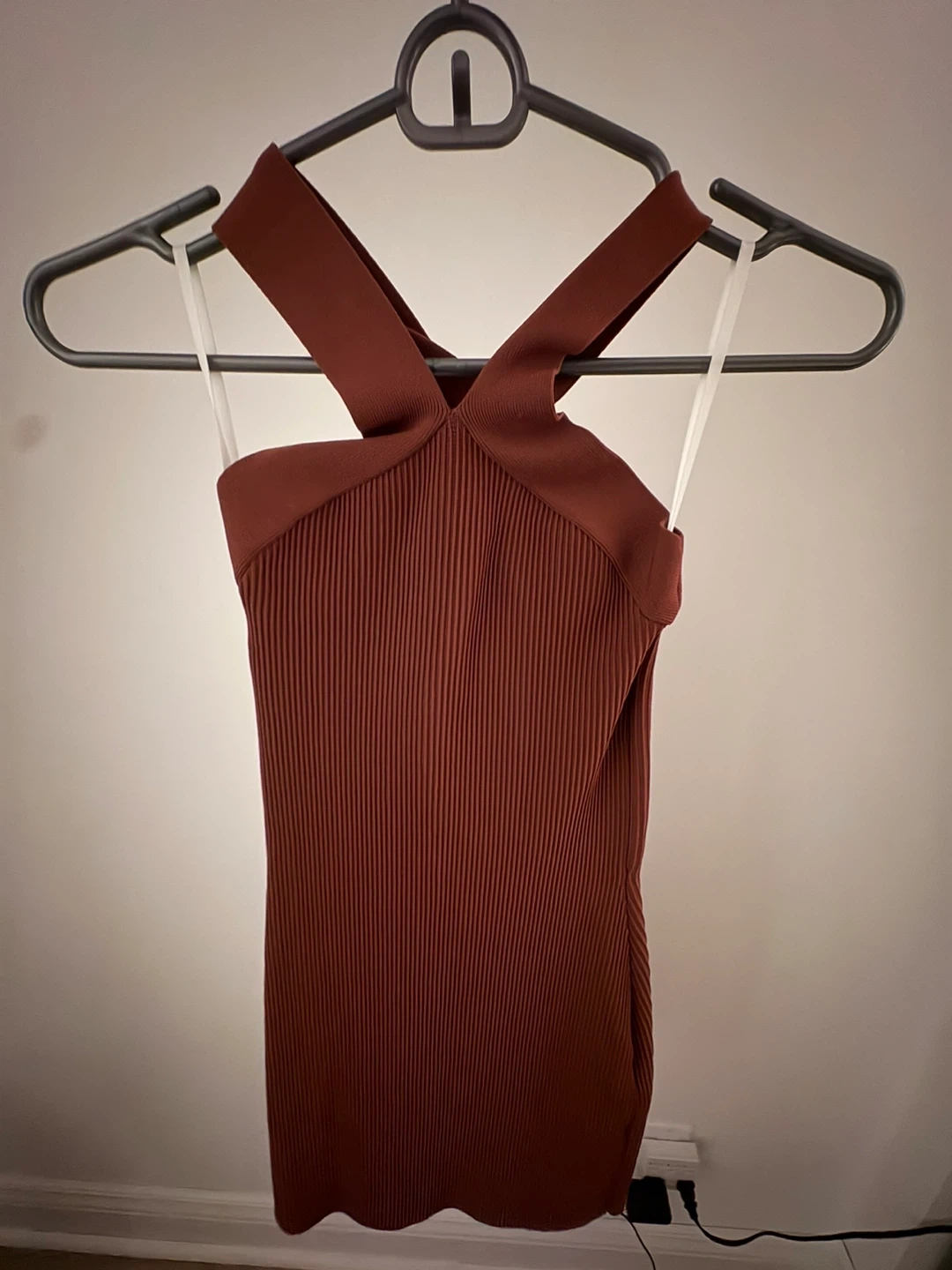 10A stylish Babaton brown ribbed halter top dress, perfect for a night out or a casual day! It's in great condition and ready for a new home. The size is XS and the material is soft and comfortable. It features a unique criss-cross halter design.