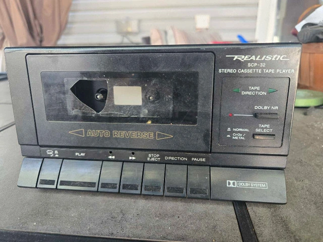 Listen to your favourite tapes with this Realistic SCP-32 stereo cassette tape player! This unit is in fair condition, showing signs of use but is still functional for playing your favourite cassette tapes. Here are some key features: * Auto Reverse * Dolby Noise Reduction * Standard RCA Line Out * Sold as is* Rediscover your old mixtapes or explore vintage sounds! Available if the ad is up – a little blast from the past ready to find a new home! Considering its condition and functionality, I'm asking $25.