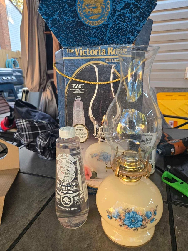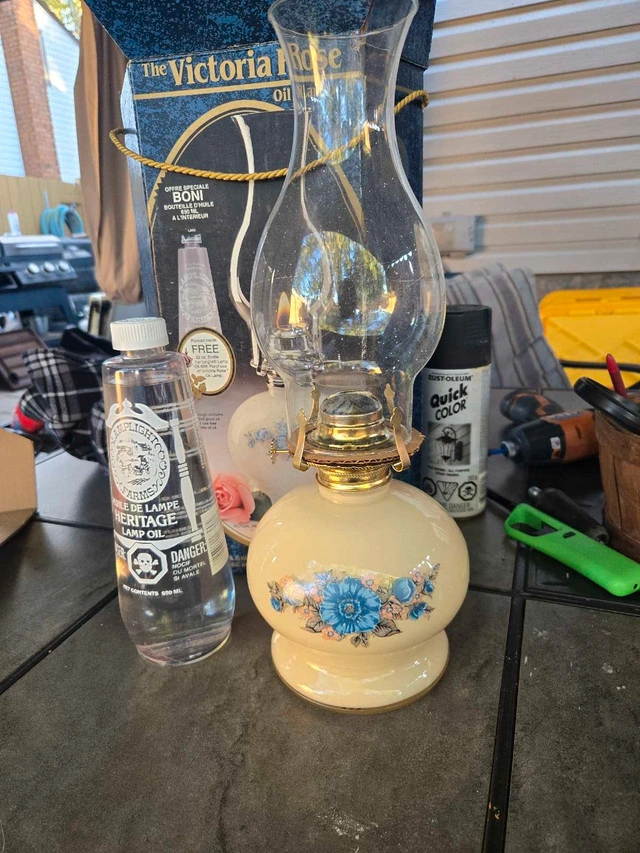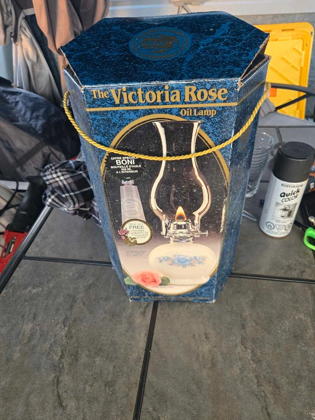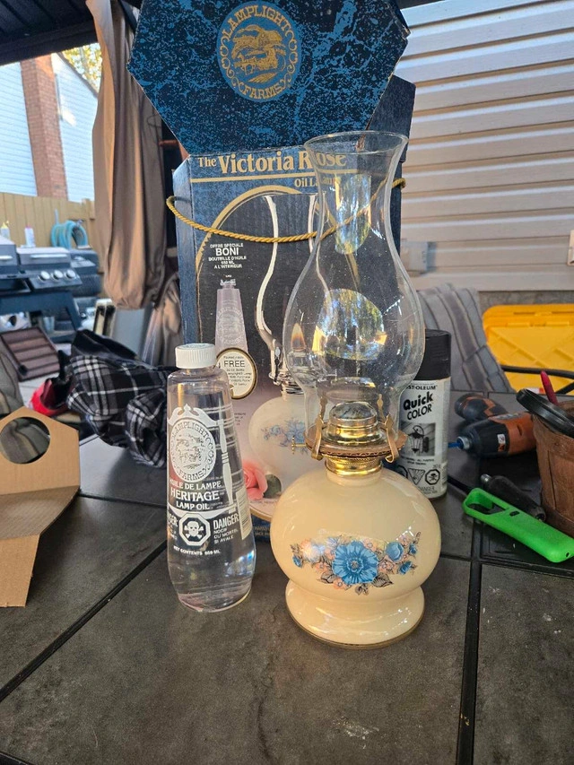 Illuminate your space with the timeless charm of this Victoria Rose Oil Lamp, complete with heritage lamp oil and its original box! This lamp features a delicate floral design on a creamy base, topped with a clear glass chimney, ready to cast a warm, inviting glow. This item is previously owned. Additional details: - Brand: Victoria Rose - Includes: Oil and original box With a touch of vintage elegance, this lamp is priced to sell. I've looked at similar oil lamps and am pricing it accordingly for its condition. If the ad is still up, the lamp is available—no need to ask, just get ready to brighten your home!