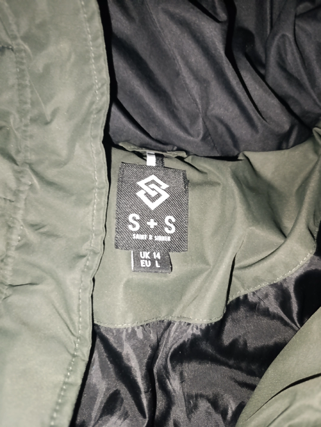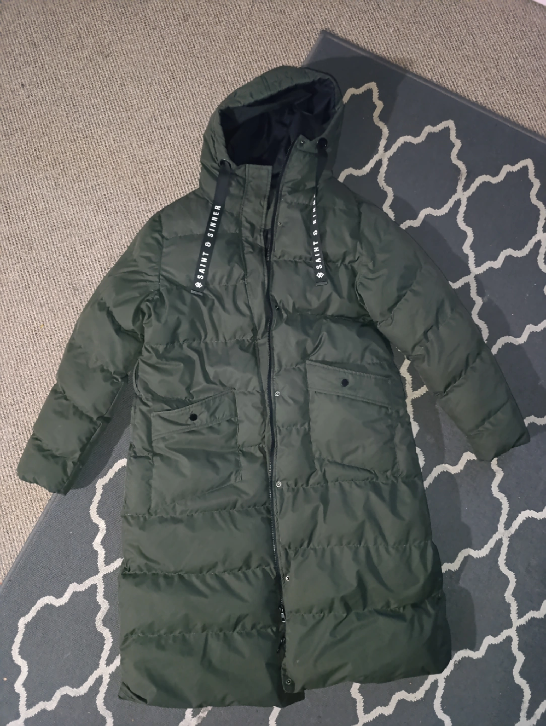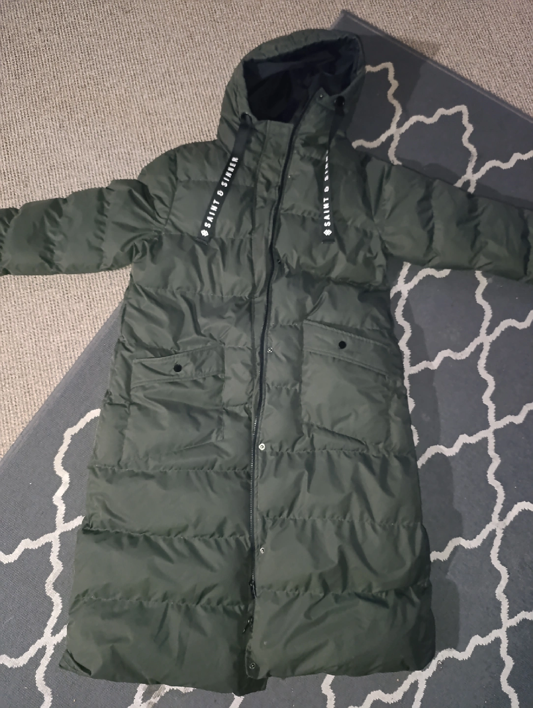Here's a Saint & Sinner puffer coat in a stylish olive green colour! It's perfect for staying warm during the colder months. The coat features a hood and a zipper closure. It's in great condition and ready for a new home
