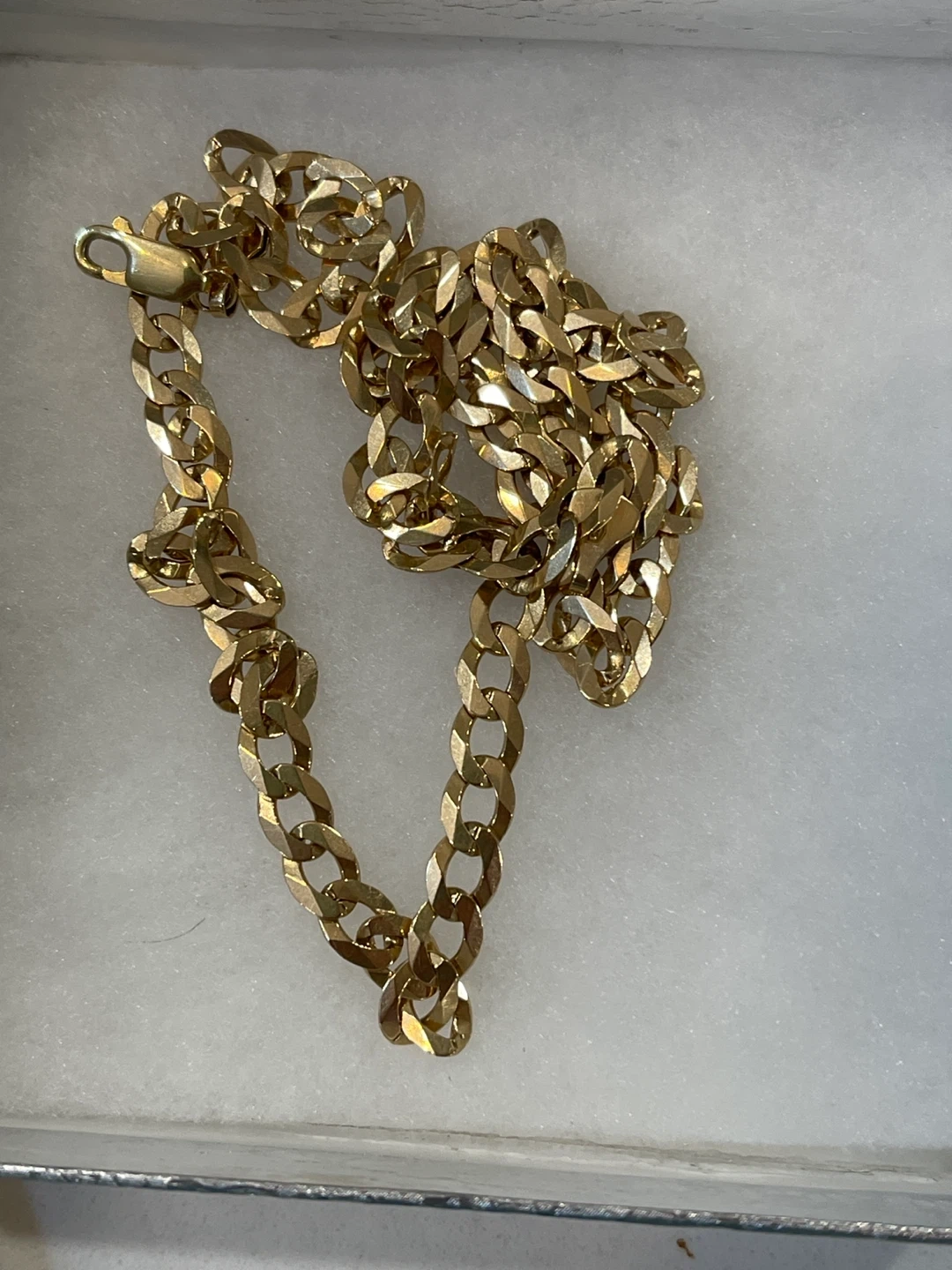 Selling a beautiful 9ct gold curb chain, marked 375. It's a solid link necklace, 20 inches in length. A heavy and excellent piece for ladies!