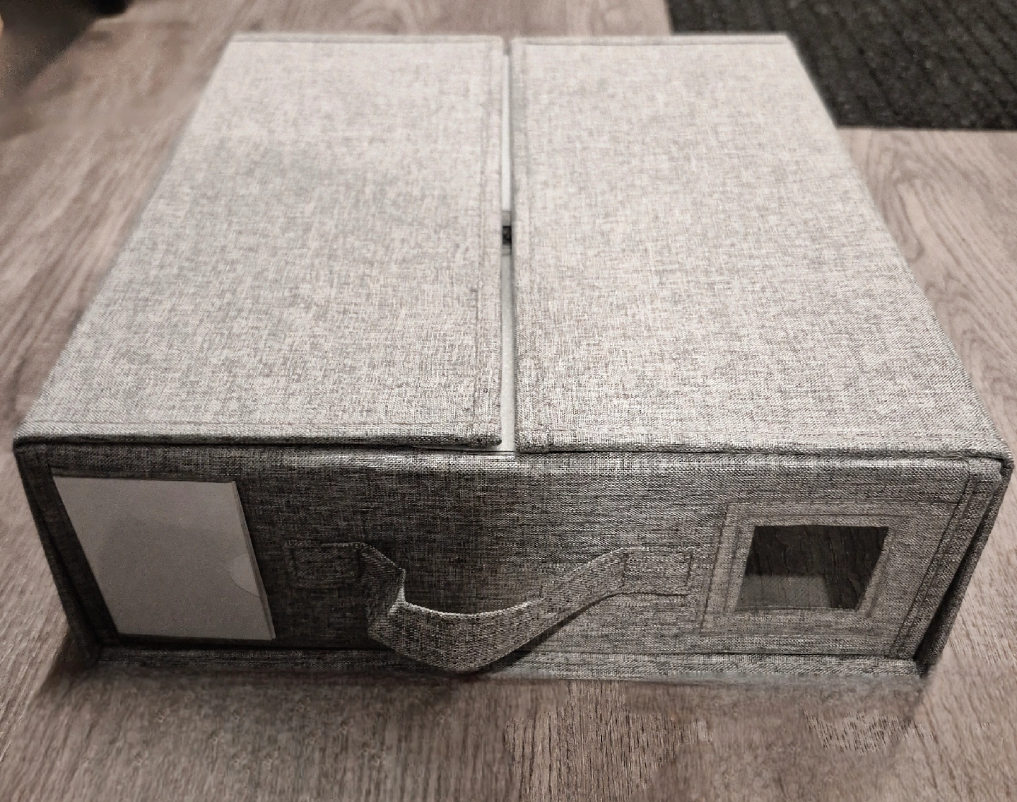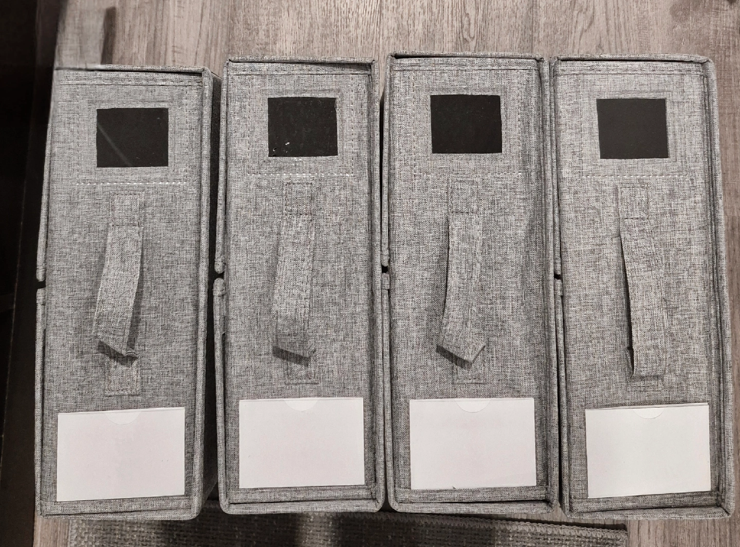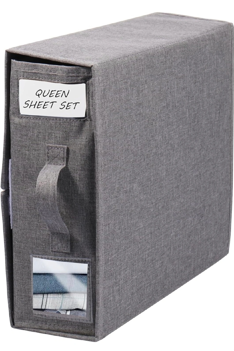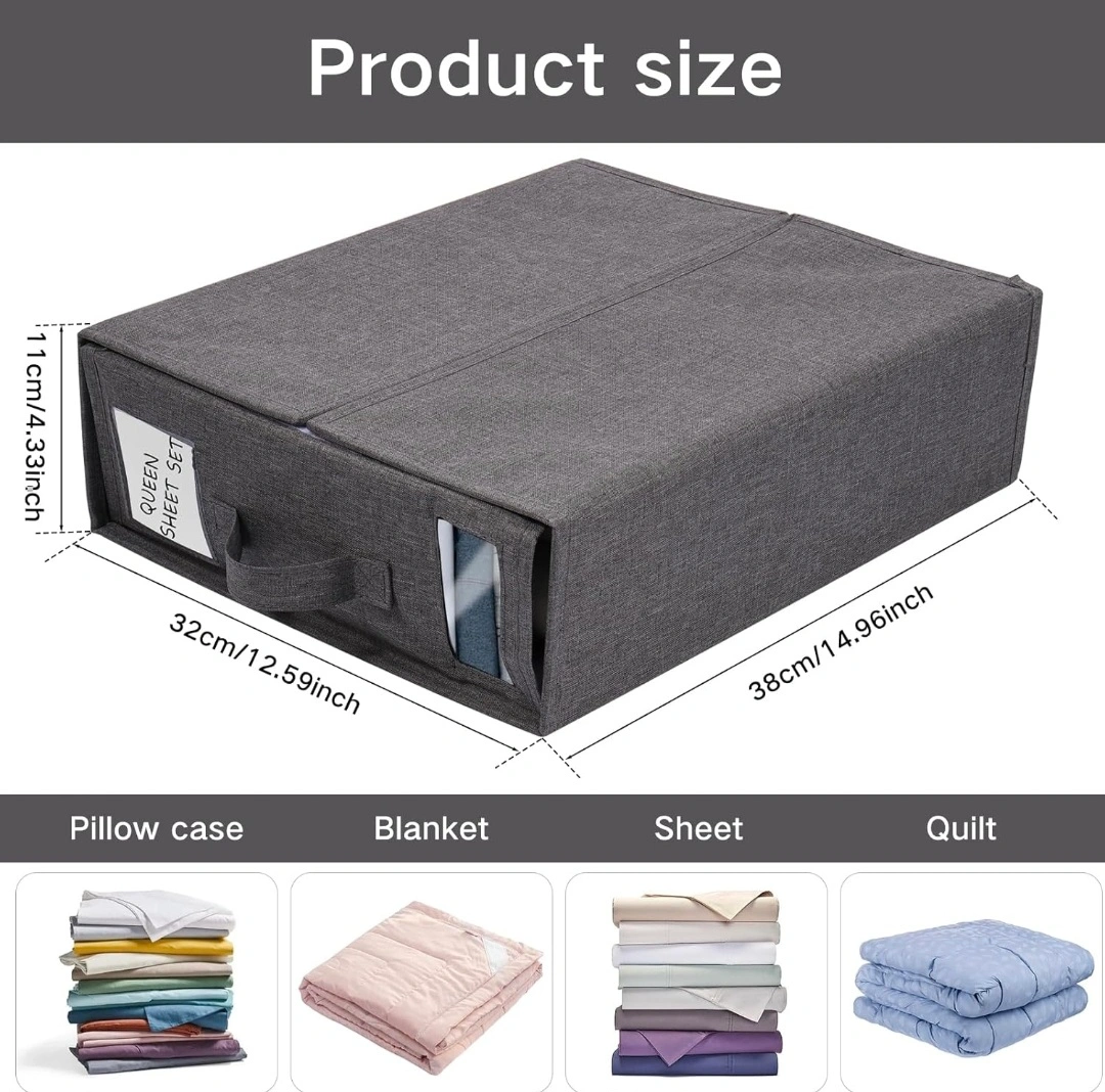 70Set of 4. New. Keep your linens tidy with these grey storage boxes! They're perfect for queen sheet sets, blankets, or quilts. The boxes feature a clear window for easy identification and a convenient handle for easy access. Folds away when not in use.