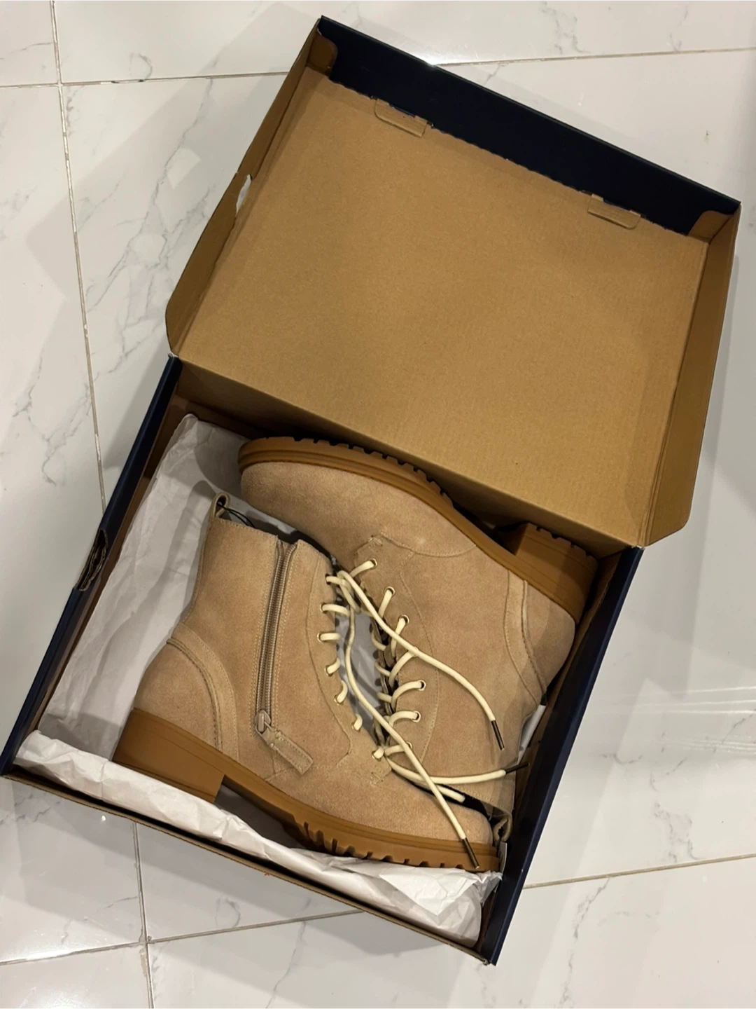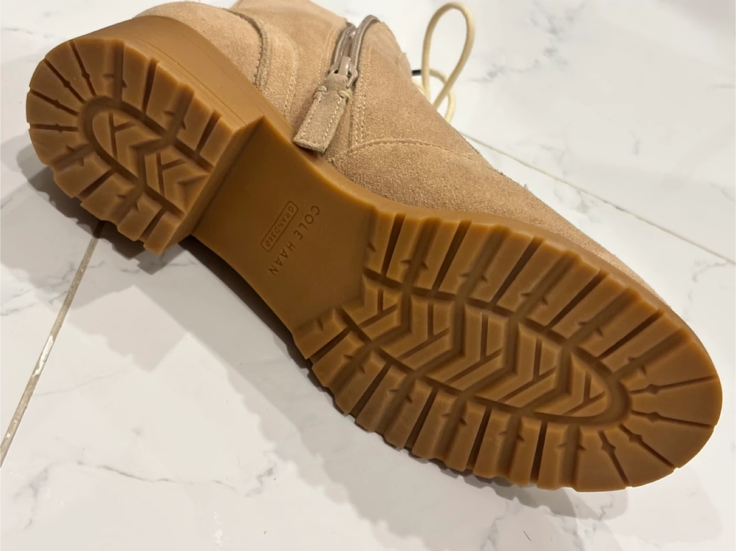 Selling a pair of Cole Haan Camea Waterproof Combat Boots in a beautiful WP Sesame Suede colour! These boots are a size 7.5B (US). They come with the original box, so they're easy to store or gift. These boots are waterproof, perfect for Canadian weather!
