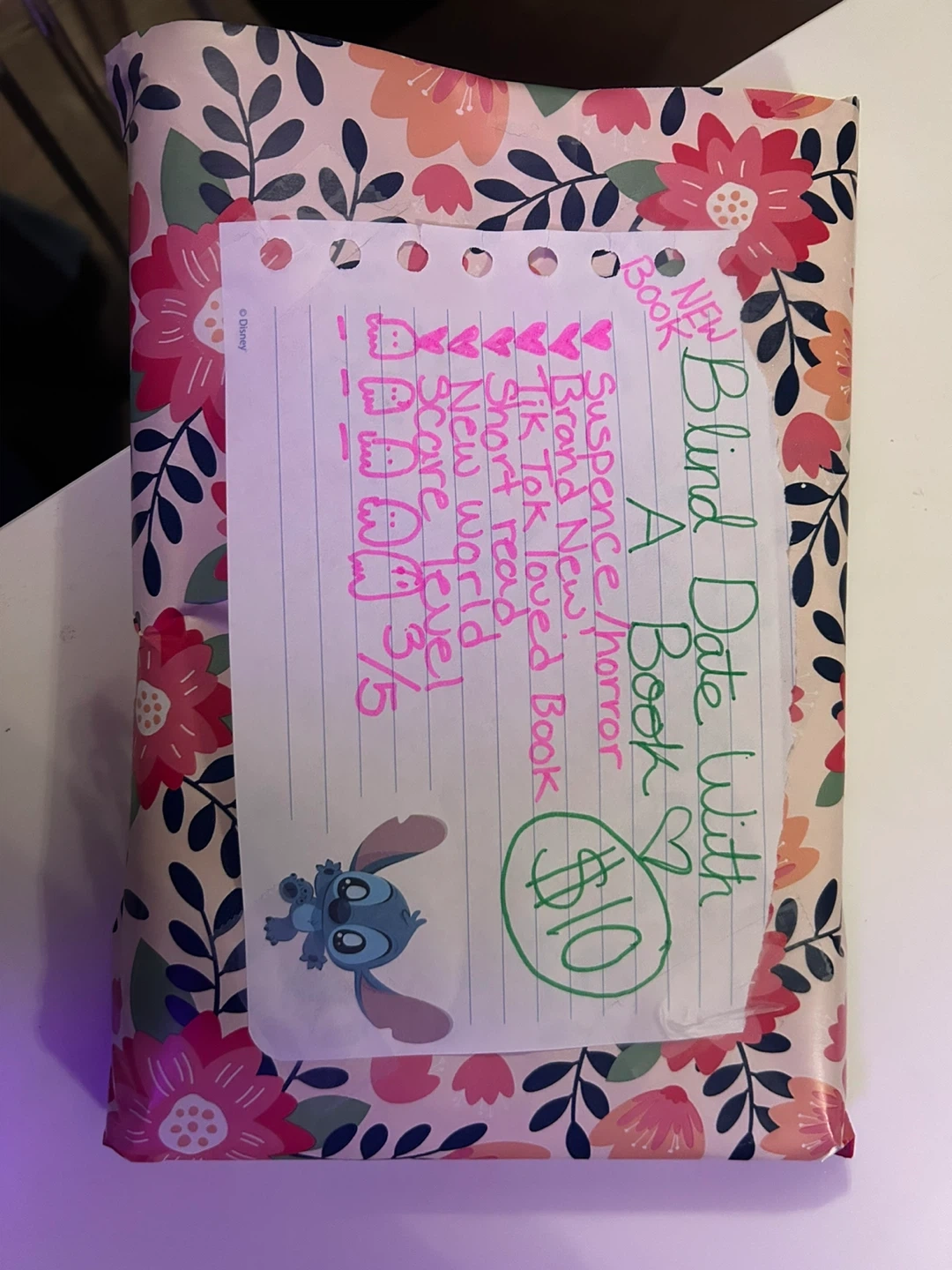 Get ready for a surprise with this 'Blind Date With a Book'! It's a brand new suspense/horror book that's been loved on TikTok. Perfect for a short read and exploring a new world. Scare level is 3/5. It's wrapped in a cute floral pattern, ready to be opened!