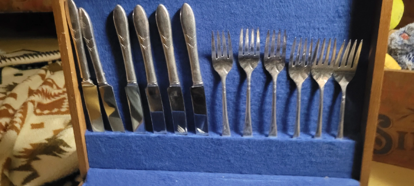 70Selling an almost complete set of vintage silver plated flatware from The brand "Community Plate", pattern *Lady Hamilton*.The set includes knives, forks, and spoons as well as several serving pieces, all neatly arranged in a wooden storage box. A beautiful addition to any dining collection.This specific pattern was first introduced in 1932. 6 dinner forks 6 dinner Knives 7 tea spoons 4 serving pieces and the wooden travel box