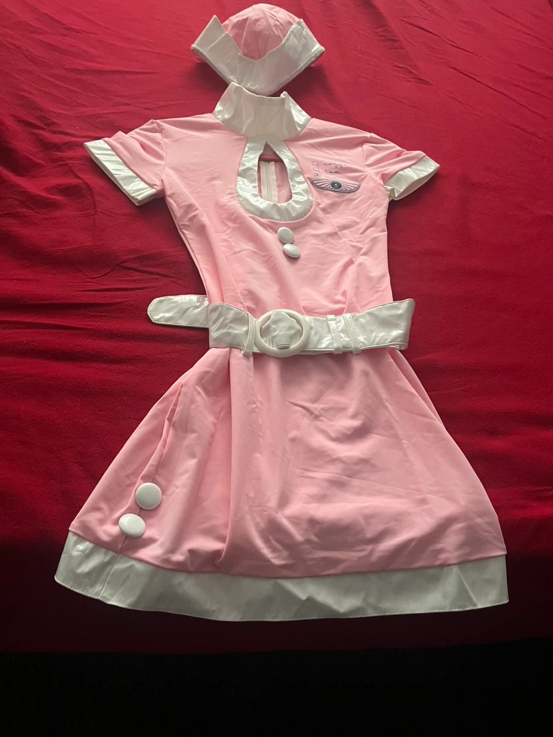 BRAND NEW! This adorable pink flight attendant costume is perfect for dress-up or Halloween! It includes the dress, belt, hat, and gloves. Size small