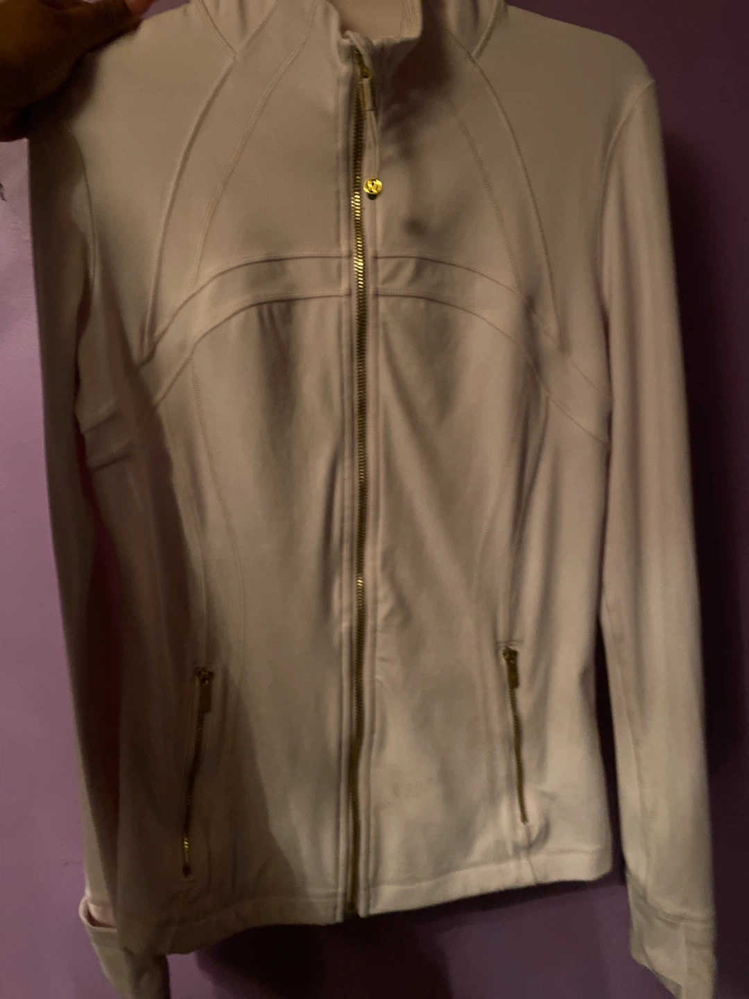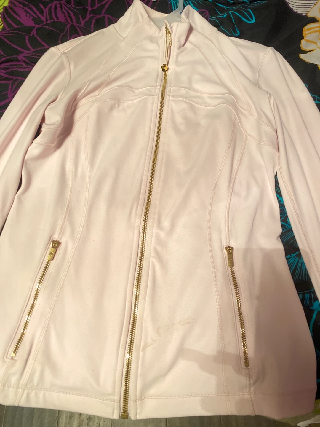 Selling a Lululemon jacket in a light pink colour. It's in good condition and has gold zippers. Perfect for layering or wearing on its own!