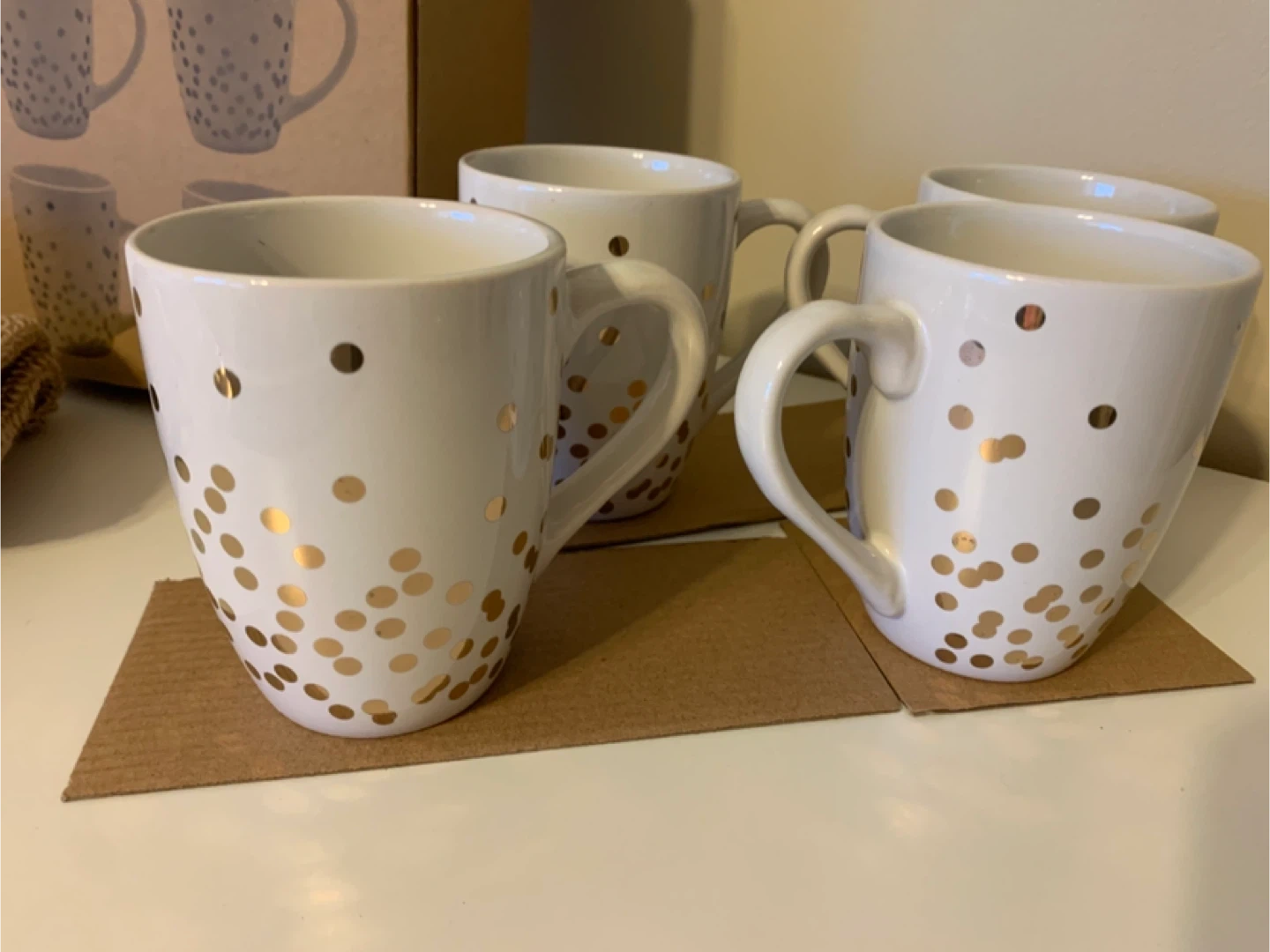 Selling a set of four Santa's Secrets ceramic mugs! They feature a cute polka dot design in gold. Each mug has a 13 oz capacity (384 ml). The box is included! This is brand new so you can re-gift it.