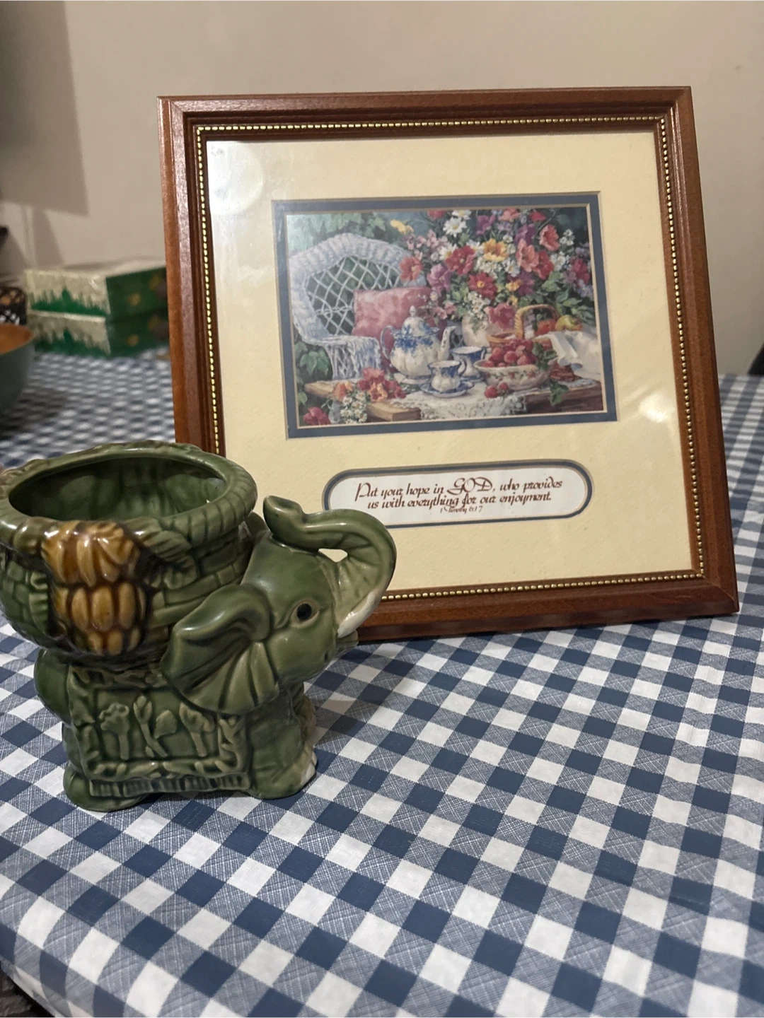 Cute elephant planter! It's green and shaped like an elephant. Perfect for small plants or succulents and wall decor.