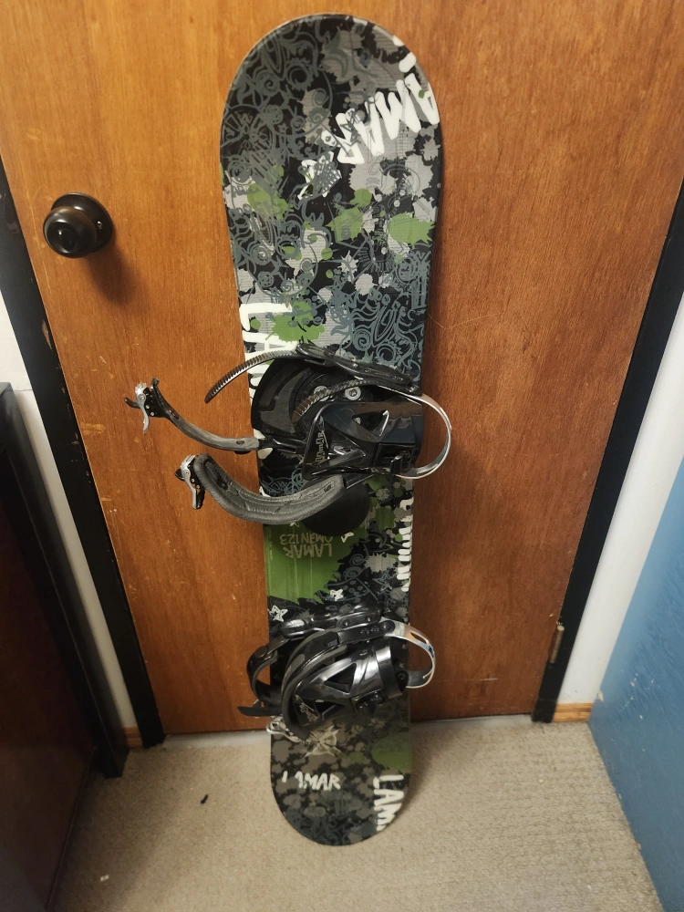 Selling a used Lamar snowboard, complete with bindings! It's ready to hit the slopes. There are some signs of wear, but it's still in good condition for some fun on the mountain