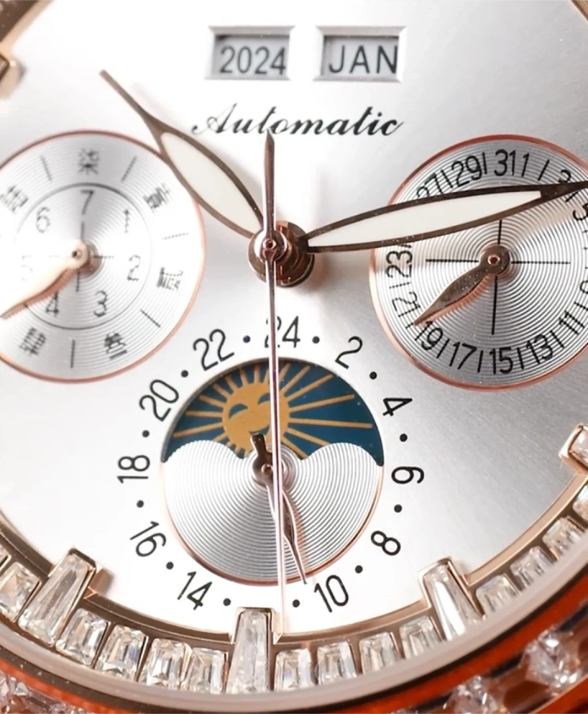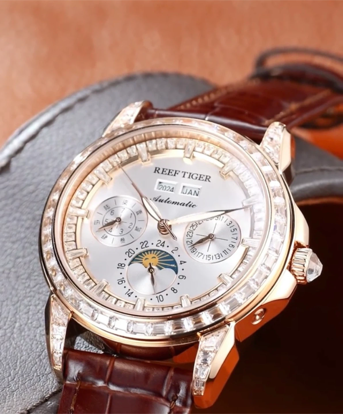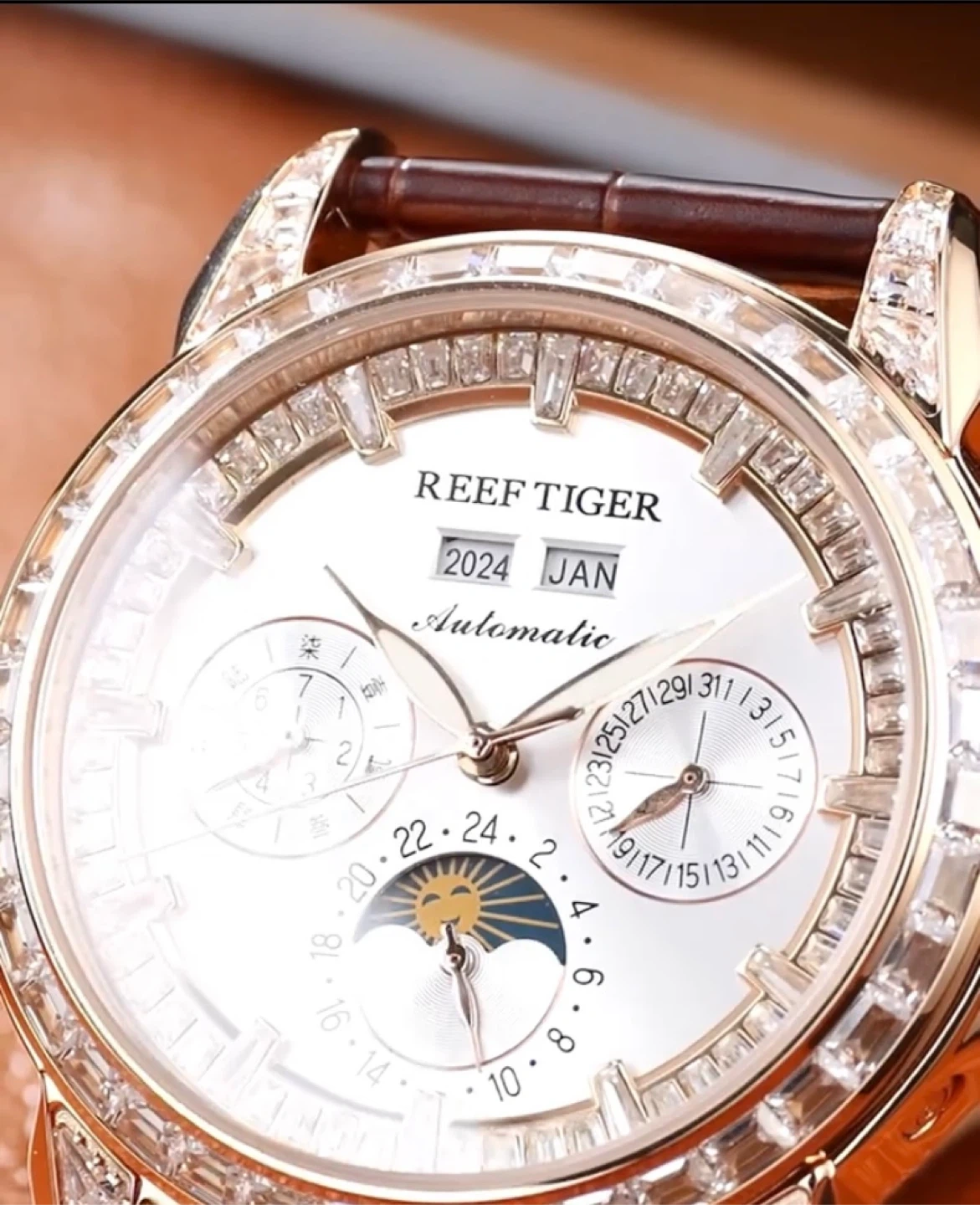 31Selling a Reef Tiger automatic watch. The face includes a date. It has a beautiful design with a strap and a decorative crystal bezel
