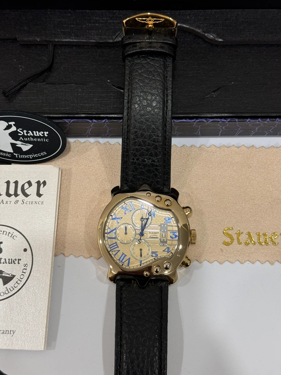 Selling a Stauer Graves Special Edition Gold-Tone Wristwatch. It comes with its original box and instruction manual. A really nice looking watch! For Guitar enthusiasts!