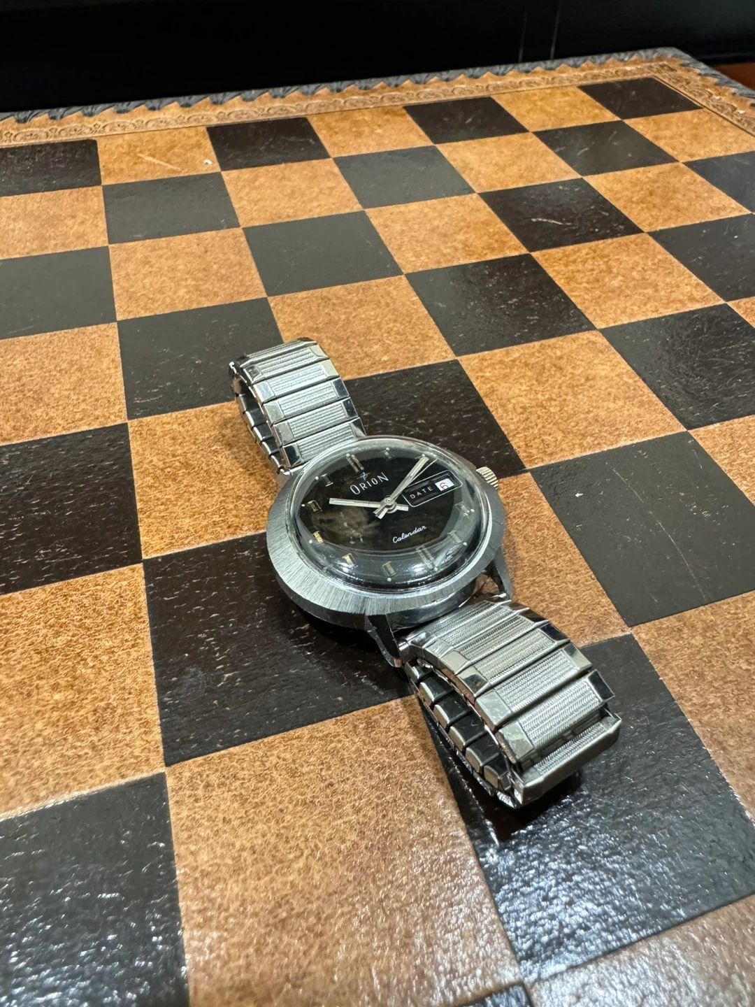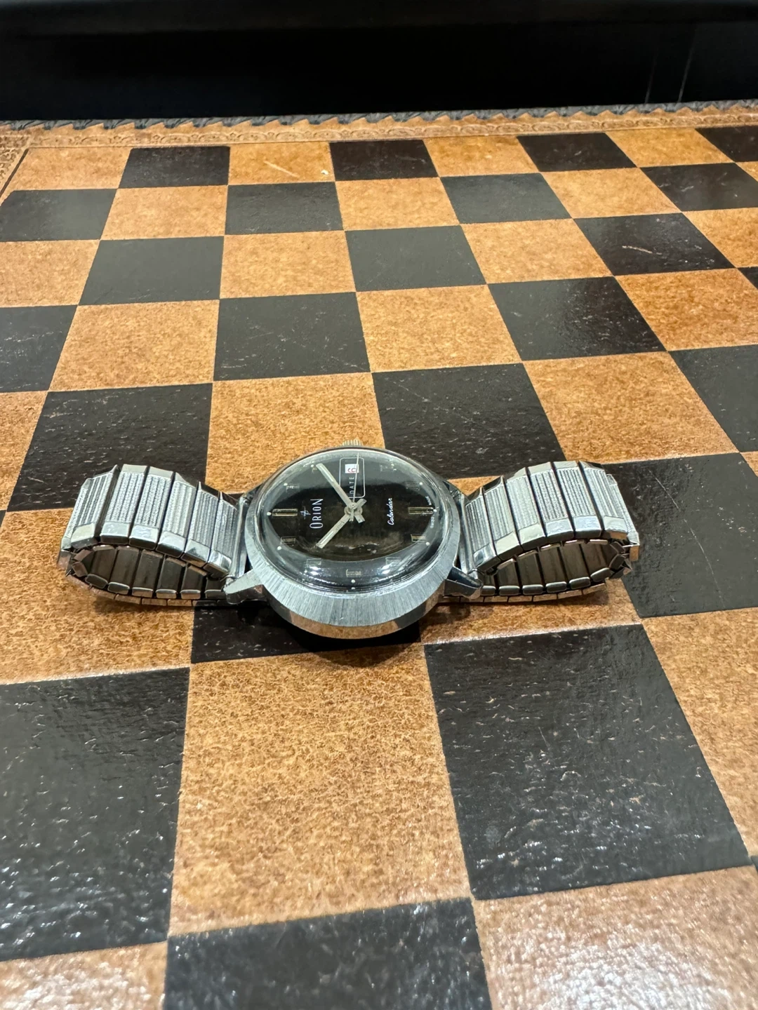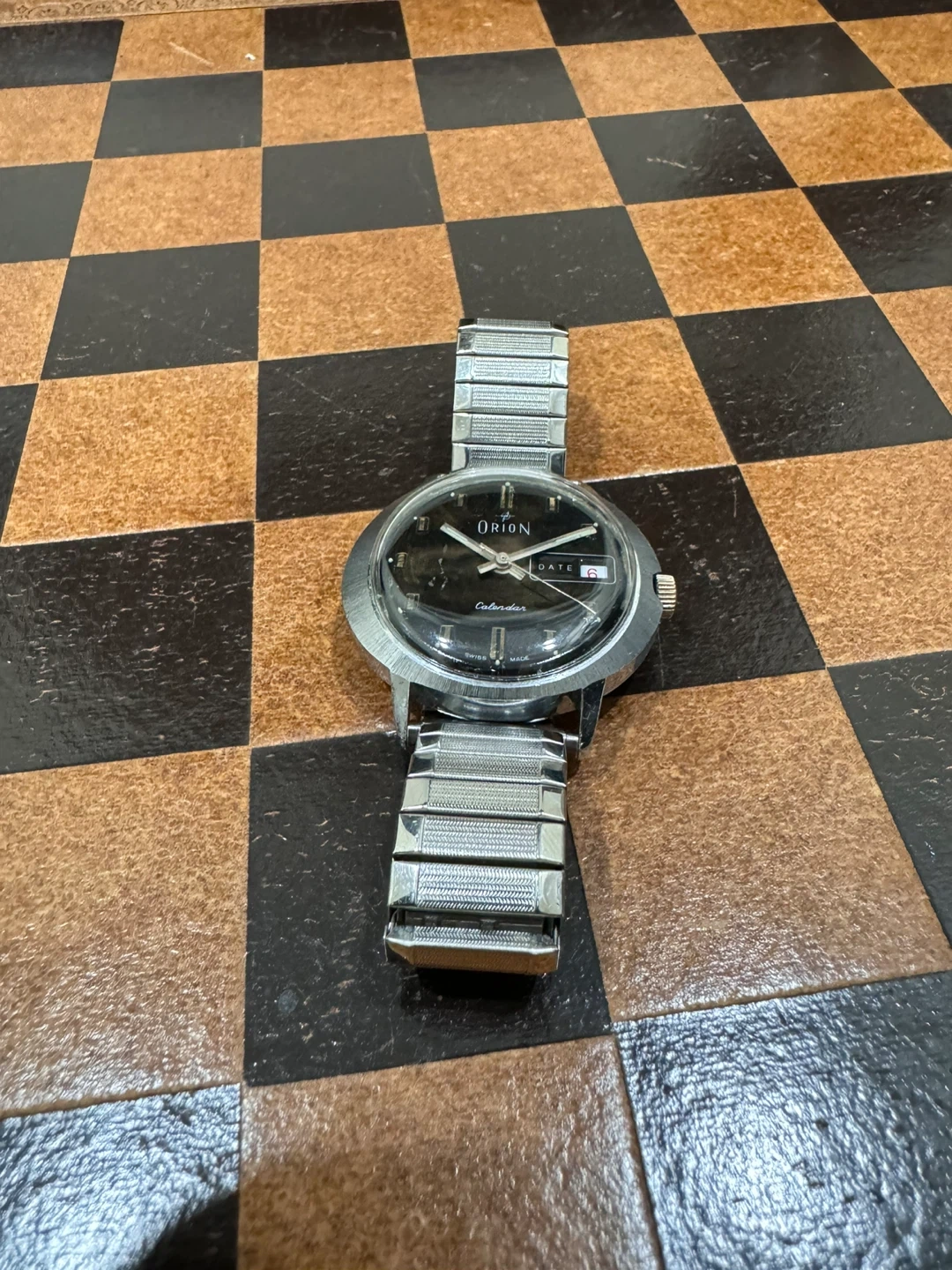 Selling a vintage Orion Date Calendar watch! It has a stainless steel band and a classic look