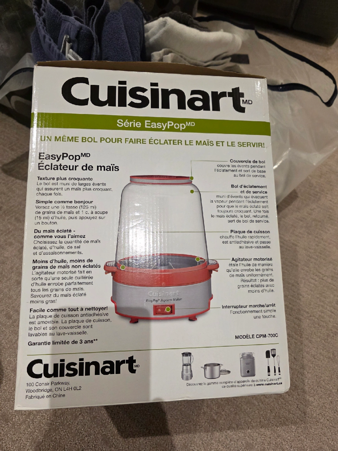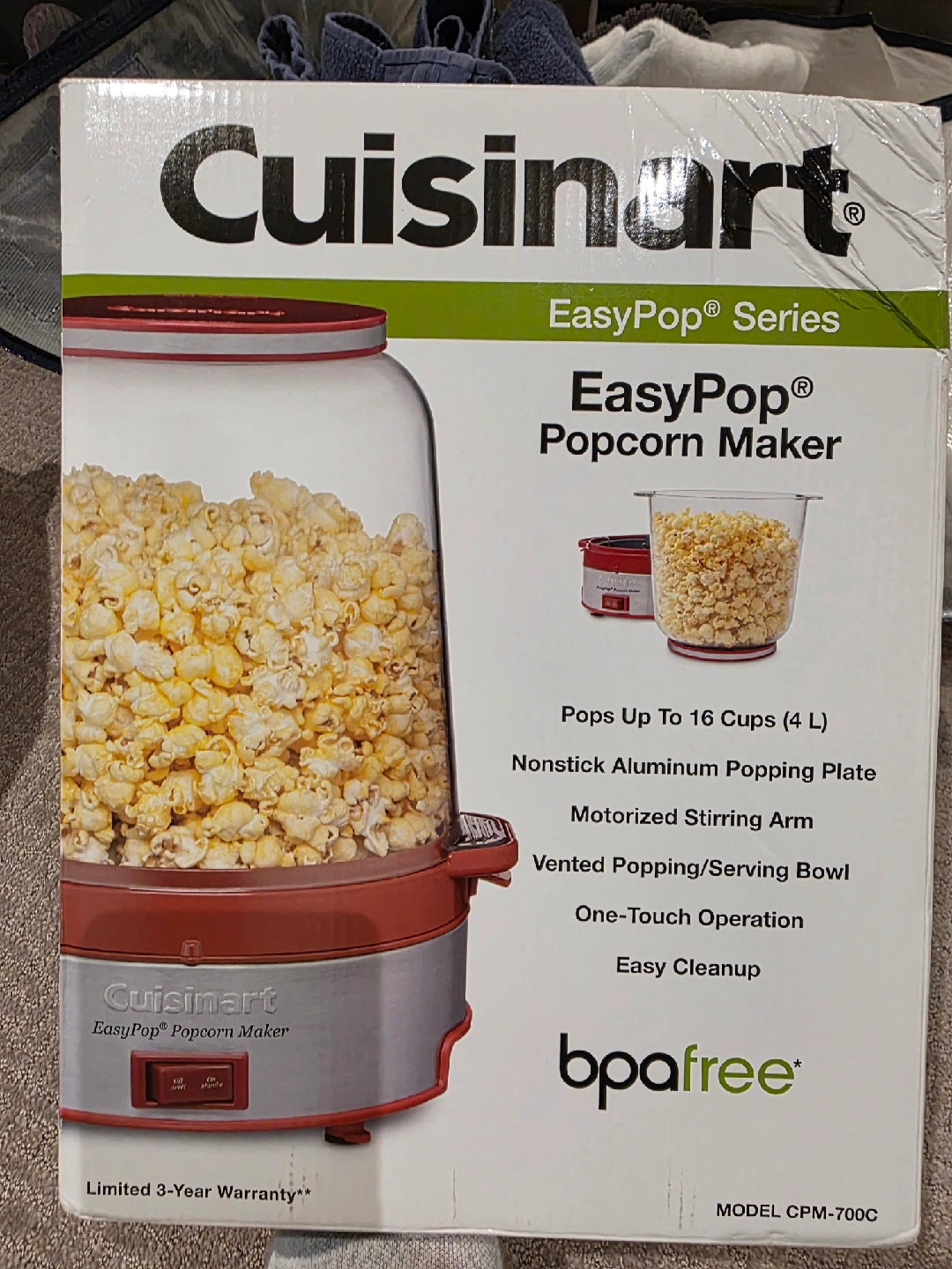 Get ready for movie nights with this Cuisinart EasyPop Popcorn Maker! This popcorn maker can pop up to 16 cups (4 L) of popcorn. It features a nonstick aluminum popping plate and a motorized stirring arm for even cooking. The vented popping/serving bowl makes it easy to serve and clean up afterwards. It also has a one-touch operation. The model number is CPM-700C. It's in like new condition and comes with the box!