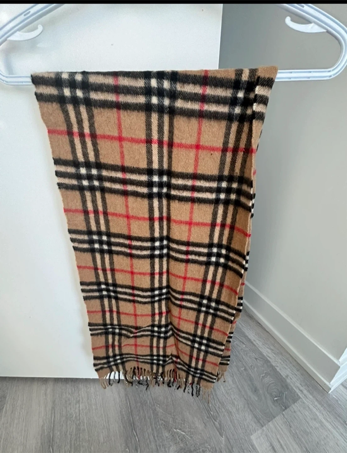 Selling a Burberrys of London scarf made of 100% cashmere. It has the classic Burberry plaid pattern. There are some signs of wear as shown in the pictures but unoticeable when wearing