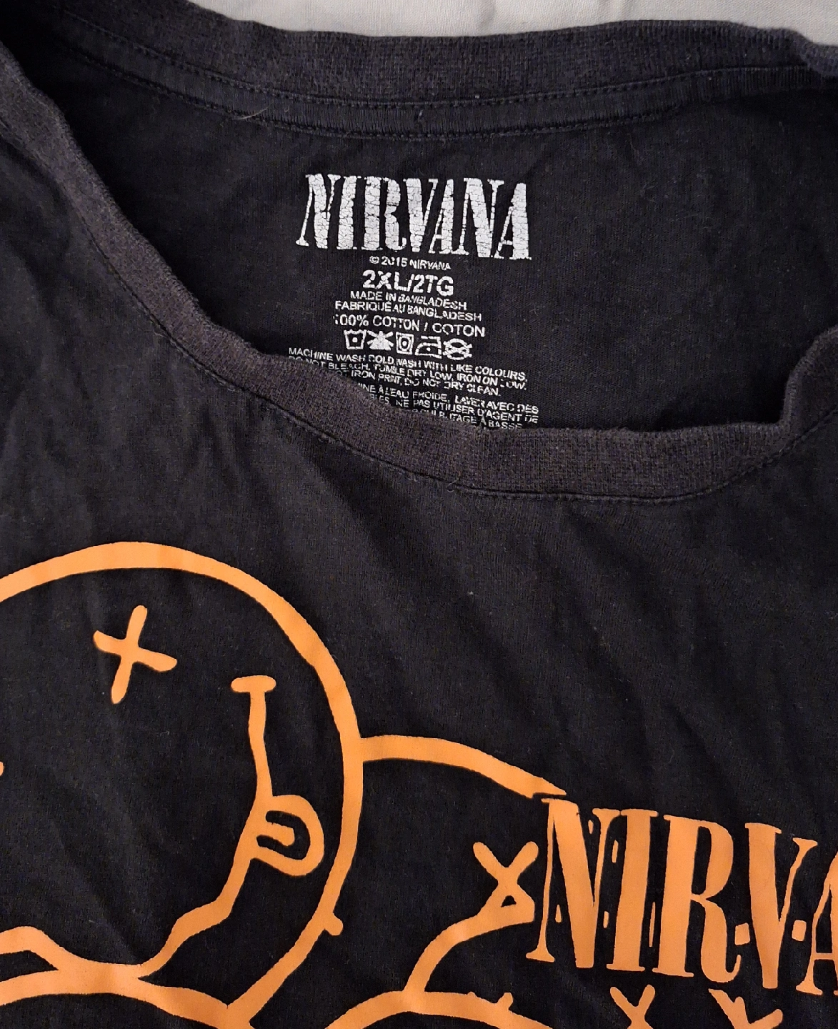 37Selling a black Nirvana graphic t-shirt in size 2XL. It's made of 100% cotton and features a cool smiley face design. Perfect for any Nirvana fan!