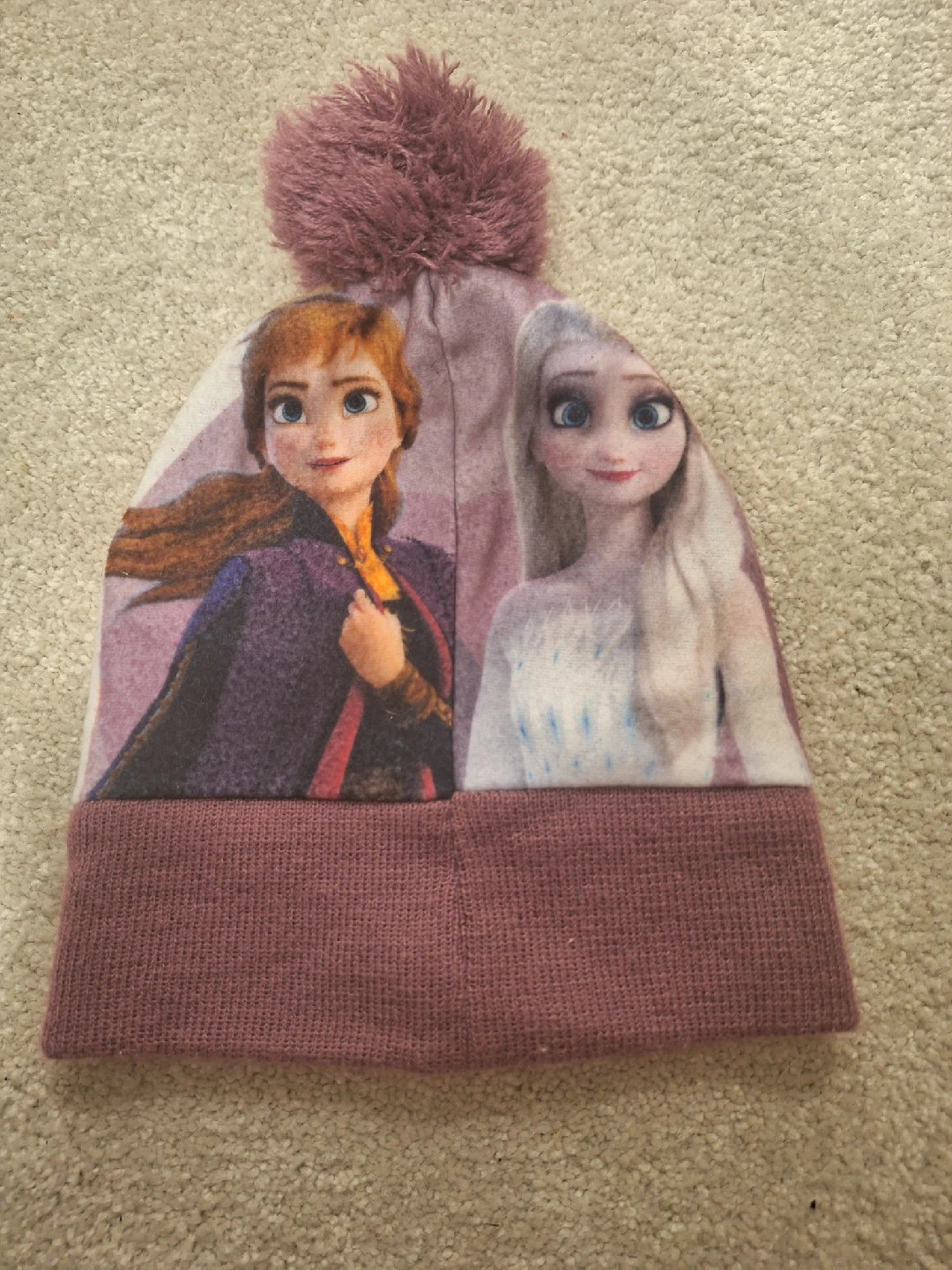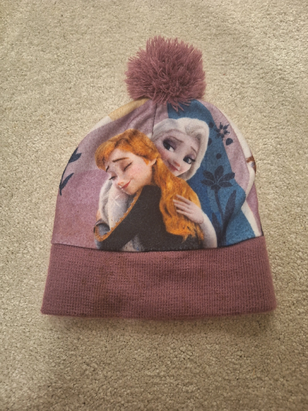 Keep your little one warm with this adorable Disney Frozen beanie! It features Anna and Elsa, and a cute pom pom on top. Perfect for any Frozen fan!