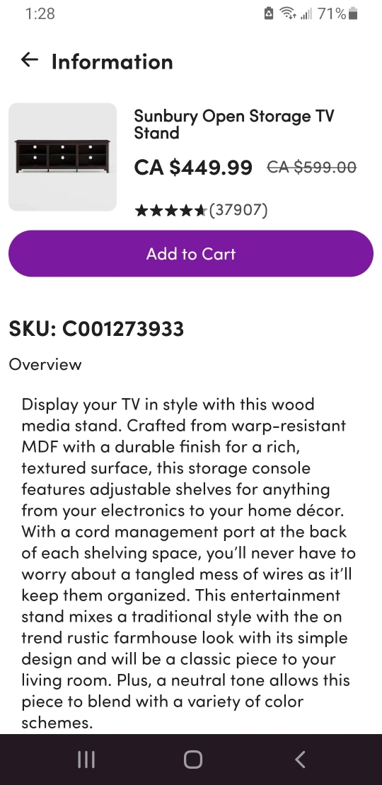 This Sunbury Open Storage TV Stand is perfect for displaying your TV in style! It's crafted from warp-resistant MDF with a durable finish and textured surface. The storage console features adjustable shelves and a cord management port to keep your electronics organized.